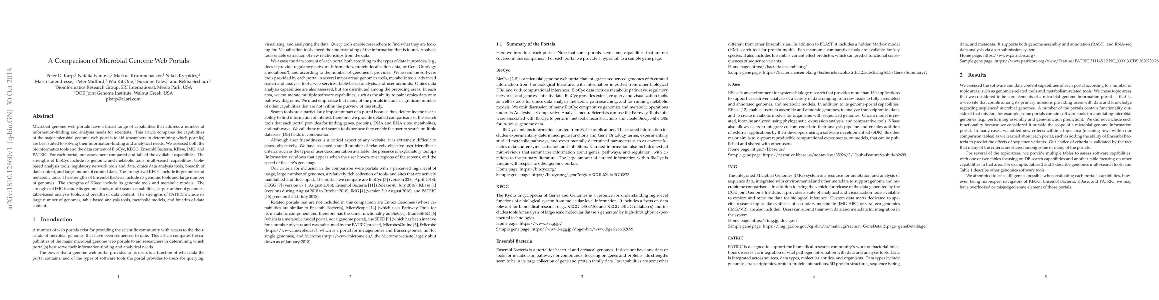 This study compared the capabilities of major microbial genome web portals, including BioCyc, KEGG, Ensembl Bacteria, KBase, IMG, and PATRIC, by assessing their bioinformatics tools and data content.