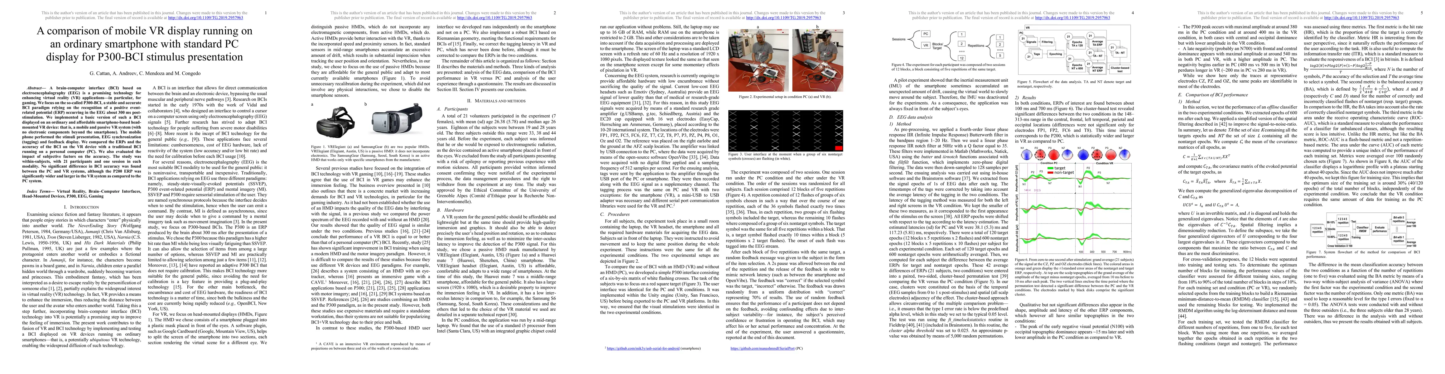 This study compares the performance of a P300-BCI system on a mobile VR display running on a smartphone versus a standard PC display, finding no significant difference in BCI accuracy between the two, though the VR system showed a larger P200 ERP.
