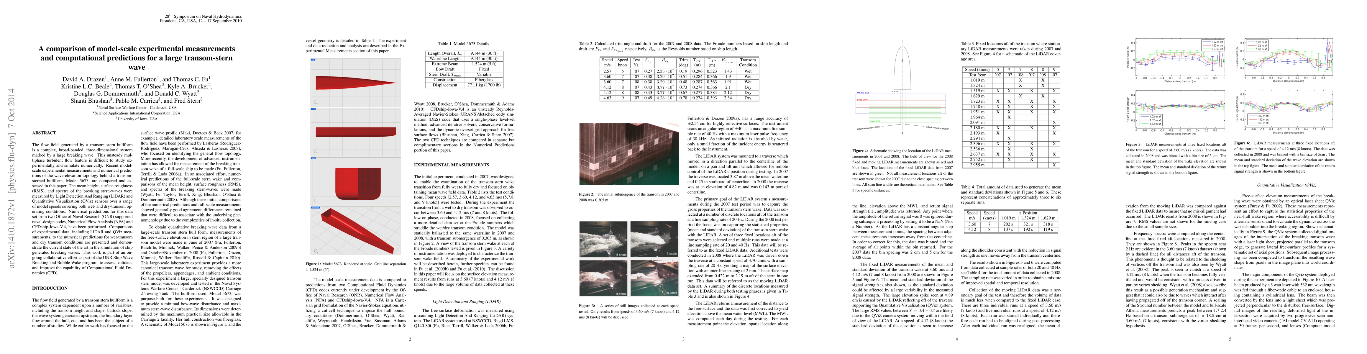 The flow field generated by a transom stern hull form is a complex, broad-banded, three-dimensional system marked by a large breaking wave. This unsteady multiphase turbulent flow feature is difficult to study experimentally and simulate numerically. Recent model-scale experimental measurements and numerical predictions of the wave-elevation topology behind a transom-sterned hull form, Model 5673, are compared and assessed in this paper. The mean height, surface roughness (RMS), and spectra of the breaking stern-waves were measured by Light Detection And Ranging (LiDAR) and Quantitative Visualization (QViz) sensors over a range of model speeds covering both wet- and dry-transom operating conditions. Numerical predictions for this data set from two Office of Naval Research (ONR) supported naval-design codes, Numerical Flow Analysis (NFA) and CFDship-Iowa-V.4, have been performed. Comparisons of experimental data, including LiDAR and QViz measurements, to the numerical predictions for wet-transom and dry transom conditions are presented and demonstrate the current state of the art in the simulation of ship generated breaking waves. This work is part of an ongoing collaborative effort as part of the ONR Ship Wave Breaking and Bubble Wake program, to assess, validate, and improve the capability of Computational Fluid Dynamics (CFD).