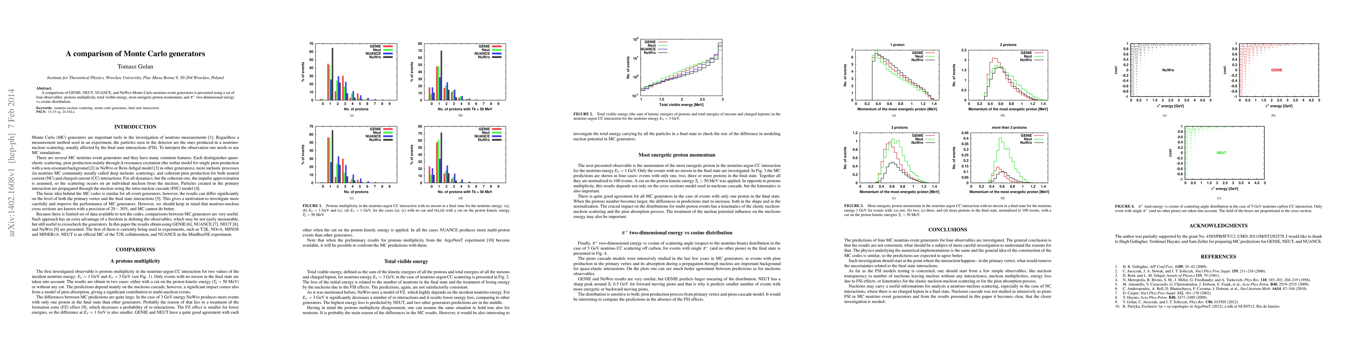 This paper compares four Monte Carlo neutrino event generators—GENIE, NEUT, NUANCE, and NuWro—using four observables: protons multiplicity, total visible energy, most energetic proton momentum, and $\pi^+$ two-dimensional energy vs cosine distribution. The study aims to evaluate their performance and differences in simulating neutrino interactions.