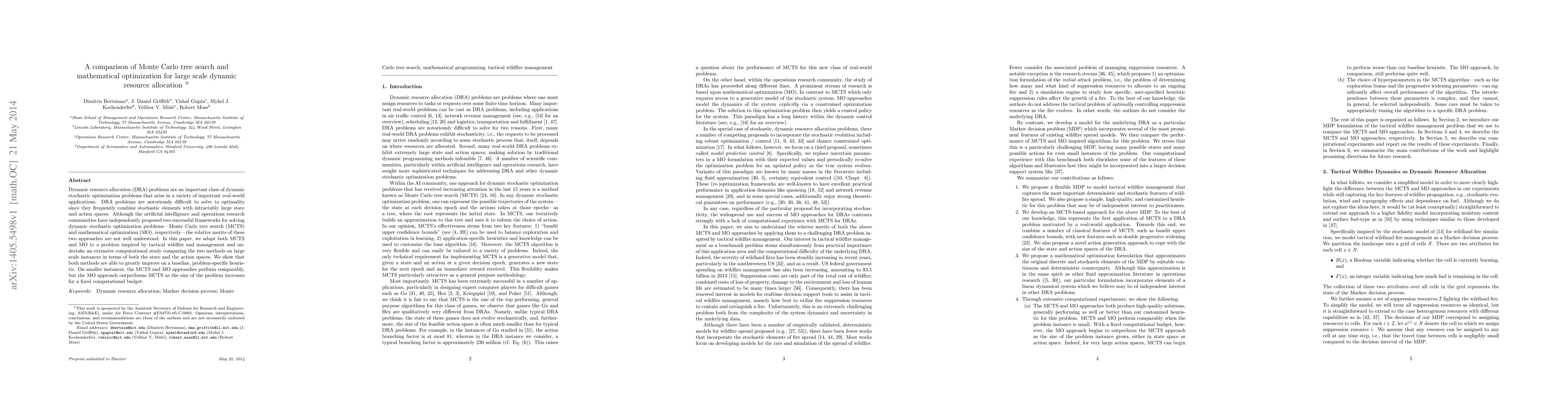 This paper compares Monte Carlo Tree Search (MCTS) and mathematical optimization methods for solving large-scale dynamic resource allocation problems. It finds that MCTS performs better on smaller instances but MO outperforms MCTS as problem size increases.