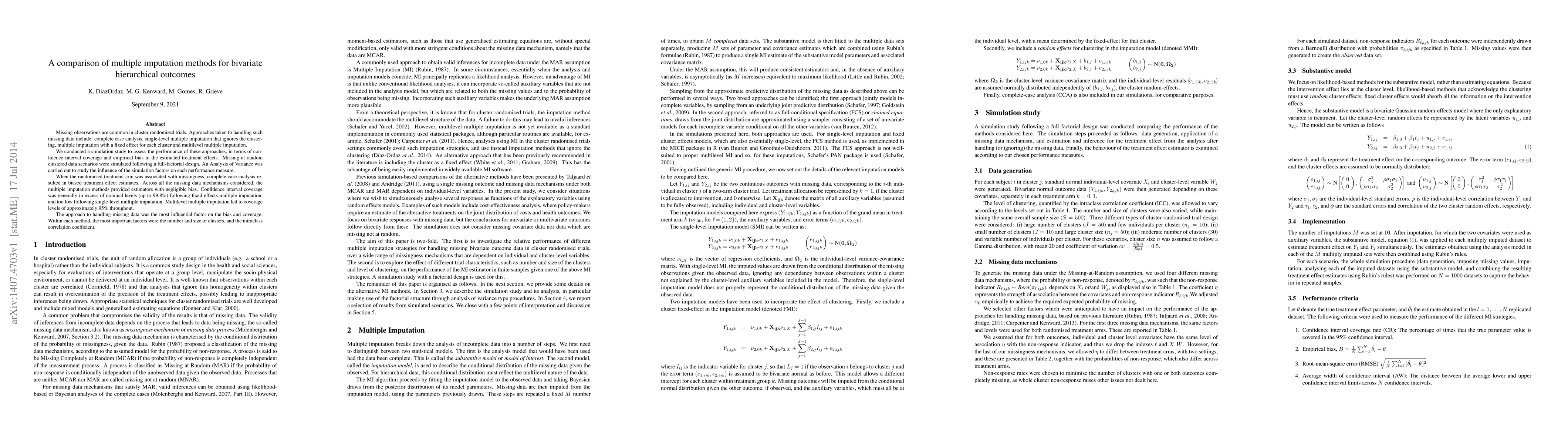 Missing observations are common in cluster randomised trials. Approaches taken to handling such missing data include: complete case analysis, single-level multiple imputation that ignores the clustering, multiple imputation with a fixed effect for each cluster and multilevel multiple imputation. We conducted a simulation study to assess the performance of these approaches, in terms of confidence interval coverage and empirical bias in the estimated treatment effects. Missing-at-random clustered data scenarios were simulated following a full-factorial design. An Analysis of Variance was carried out to study the influence of the simulation factors on each performance measure. When the randomised treatment arm was associated with missingness, complete case analysis resulted in biased treatment effect estimates. Across all the missing data mechanisms considered, the multiple imputation methods provided estimators with negligible bias. Confidence interval coverage was generally in excess of nominal levels (up to 99.8%) following fixed-effects multiple imputation, and too low following single-level multiple imputation. Multilevel multiple imputation led to coverage levels of approximately 95% throughout. The approach to handling missing data was the most influential factor on the bias and coverage. Within each method, the most important factors were the number and size of clusters, and the intraclass correlation coefficient.