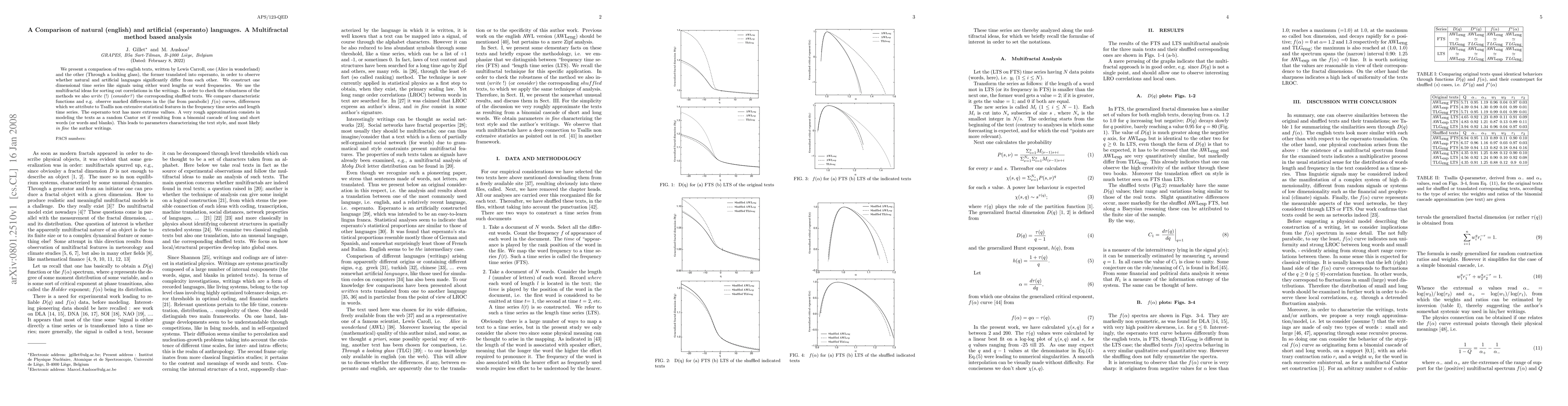 We present a comparison of two english texts, written by Lewis Carroll, one (Alice in wonderland) and the other (Through a looking glass), the former translated into esperanto, in order to observe whether natural and artificial languages significantly differ from each other. We construct one dimensional time series like signals using either word lengths or word frequencies. We use the multifractal ideas for sorting out correlations in the writings. In order to check the robustness of the methods we also write the corresponding shuffled texts. We compare characteristic functions and e.g. observe marked differences in the (far from parabolic) f(alpha) curves, differences which we attribute to Tsallis non extensive statistical features in the ''frequency time series'' and ''length time series''. The esperanto text has more extreme vallues. A very rough approximation consists in modeling the texts as a random Cantor set if resulting from a binomial cascade of long and short words (or words and blanks). This leads to parameters characterizing the text style, and most likely in fine the author writings.