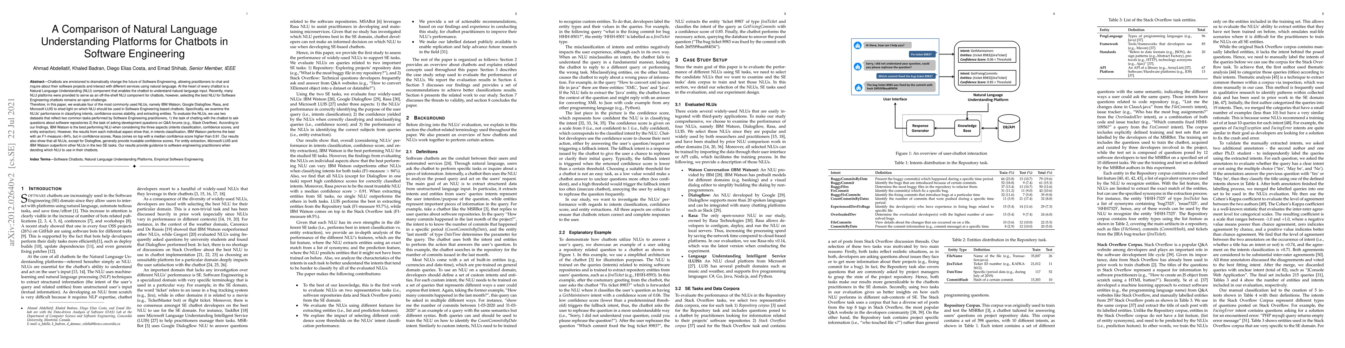 This paper evaluates four popular Natural Language Understanding (NLU) platforms—IBM Watson, Google Dialogflow, Rasa, and Microsoft LUIS—for use in Software Engineering chatbots. The study finds that IBM Watson performs best overall in intent classification, confidence score stability, and entity extraction, though Rasa excels in confidence scores and Microsoft LUIS leads in entity extraction.