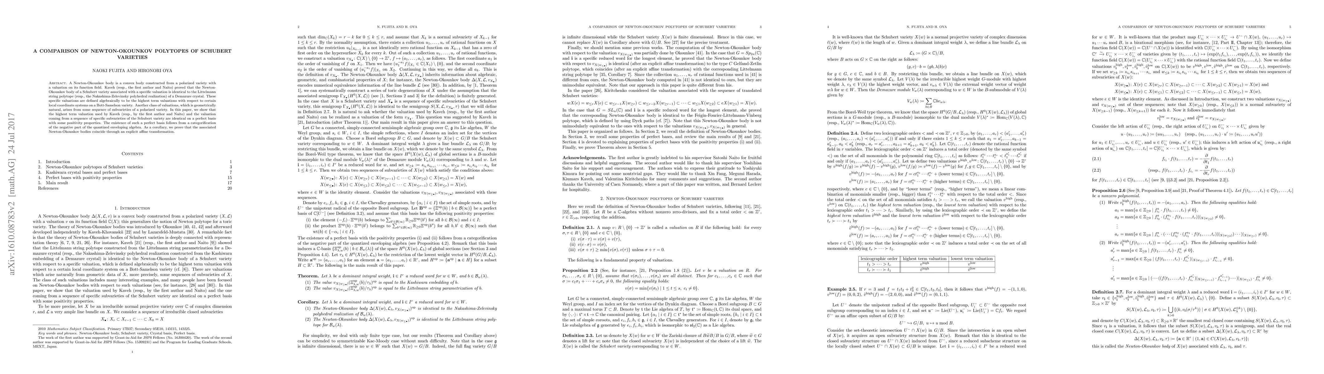 A Newton-Okounkov body is a convex body constructed from a polarized variety with a valuation on its function field. Kaveh (resp., the first author and Naito) proved that the Newton-Okounkov body of a Schubert variety associated with a specific valuation is identical to the Littelmann string polytope (resp., the Nakashima-Zelevinsky polyhedral realization) of a Demazure crystal. These specific valuations are defined algebraically to be the highest term valuations with respect to certain local coordinate systems on a Bott-Samelson variety. Another class of valuations, which is geometrically natural, arises from some sequence of subvarieties of a polarized variety. In this paper, we show that the highest term valuation used by Kaveh (resp., by the first author and Naito) and the valuation coming from a sequence of specific subvarieties of the Schubert variety are identical on a perfect basis with some positivity properties. The existence of such a perfect basis follows from a categorification of the negative part of the quantized enveloping algebra. As a corollary, we prove that the associated Newton-Okounkov bodies coincide through an explicit affine transformation.