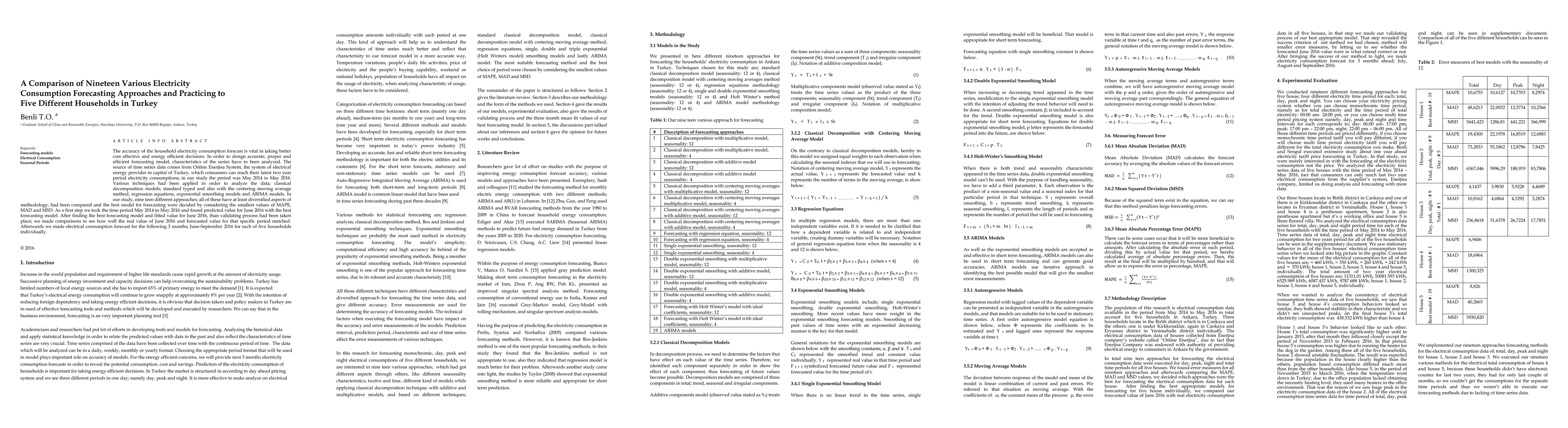 This study compares nineteen diverse electricity consumption forecasting methods applied to five Turkish households' data from May 2014 to May 2016, sourced from the Online Enerjisa System. The best model was selected based on the smallest MAPE, MAD, and MSD values, and validated by comparing the forecasted June 2016 consumption with actual values.