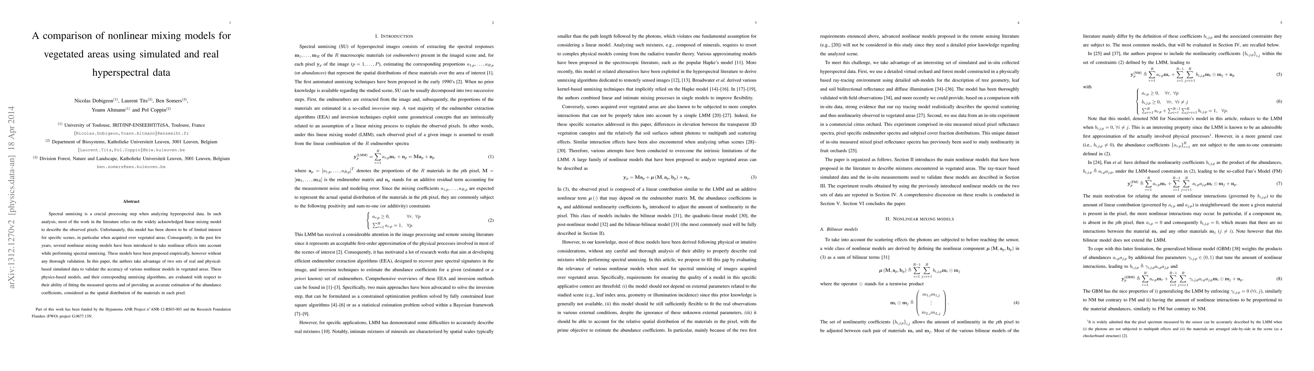 Spectral unmixing is a crucial processing step when analyzing hyperspectral data. In such analysis, most of the work in the literature relies on the widely acknowledged linear mixing model to describe the observed pixels. Unfortunately, this model has been shown to be of limited interest for specific scenes, in particular when acquired over vegetated areas. Consequently, in the past few years, several nonlinear mixing models have been introduced to take nonlinear effects into account while performing spectral unmixing. These models have been proposed empirically, however without any thorough validation. In this paper, the authors take advantage of two sets of real and physical-based simulated data to validate the accuracy of various nonlinear models in vegetated areas. These physics-based and analysis models, and their corresponding unmixing algorithms, are evaluated with respect to their ability of fitting the measured spectra and of providing an accurate estimation of the abundance coefficients, considered as the spatial distribution of the materials in each pixel.