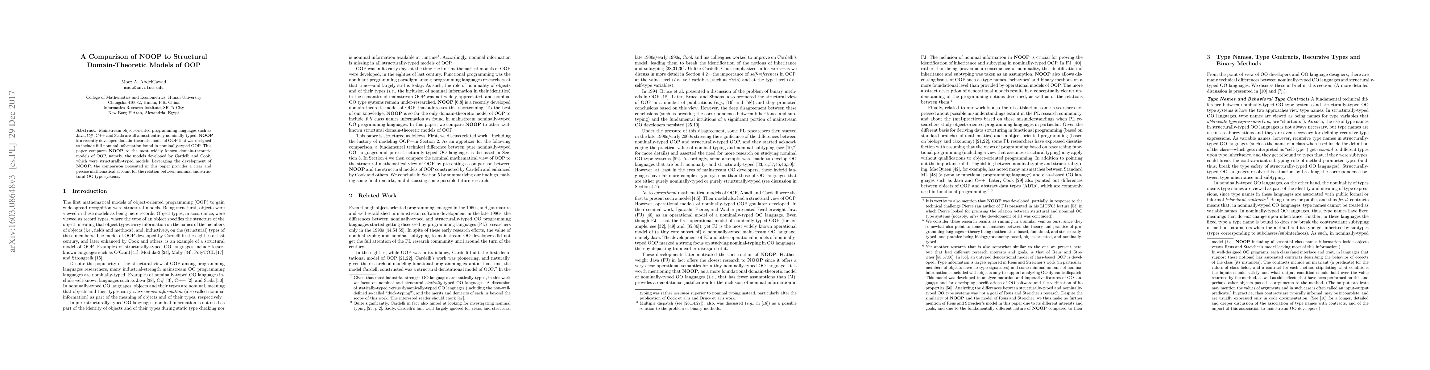 A comparison study between a recently developed domain-theoretic model of object-oriented programming (NOOP) and structurally-typed models, highlighting the relation between nominal and structural OO type systems.