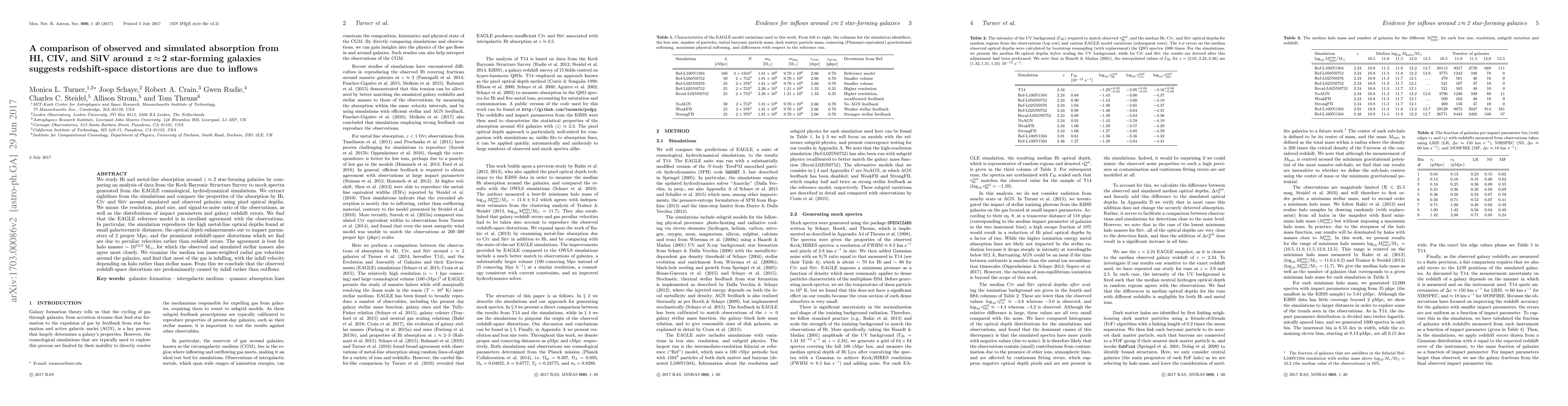 We study HI and metal-line absorption around $z\approx2$ star-forming galaxies by comparing an analysis of data from the Keck Baryonic Structure Survey to mock spectra generated from the EAGLE cosmological, hydrodynamical simulations. We extract sightlines from the simulations and compare the properties of the absorption by HI, CIV and SiIV around simulated and observed galaxies using pixel optical depths. We mimic the resolution, pixel size, and signal-to-noise ratio of the observations, as well as the distributions of impact parameters and galaxy redshift errors. We find that the EAGLE reference model is in excellent agreement with the observations. In particular, the simulation reproduces the high metal-line optical depths found at small galactocentric distances, the optical depth enhancements out to impact parameters of 2 proper Mpc, and the prominent redshift-space distortions which we find are due to peculiar velocities rather than redshift errors. The agreement is best for halo masses $\sim10^{12.0}$ M$_\odot$, for which the observed and simulated stellar masses also agree most closely. We examine the median ion mass-weighted radial gas velocities around the galaxies, and find that most of the gas is infalling, with the infall velocity depending on halo rather than stellar mass. From this we conclude that the observed redshift-space distortions are predominantly caused by infall rather than outflows.