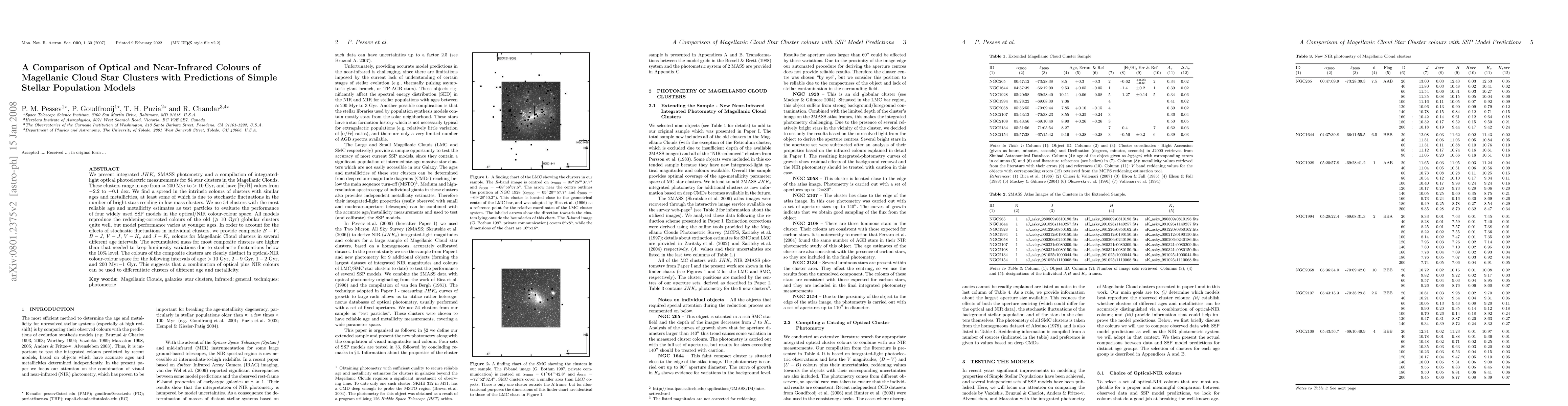 This study compares the optical and near-infrared colours of 84 star clusters in the Magellanic Clouds with predictions from simple stellar population models. The clusters show intrinsic colour variations due to stochastic fluctuations, especially in low-mass clusters, and the models perform well for old clusters but vary in accuracy for younger ones.