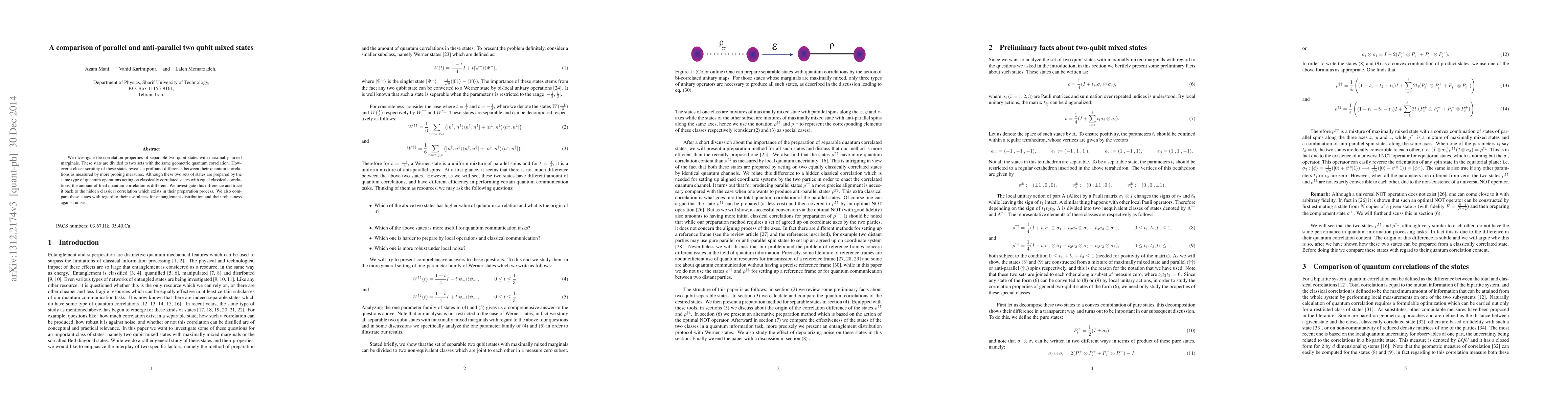 This paper compares parallel and anti-parallel two-qubit mixed states, revealing significant differences in quantum correlations despite identical geometric properties. The study highlights the impact of hidden classical correlations in their preparation and evaluates their utility for entanglement distribution and noise robustness.