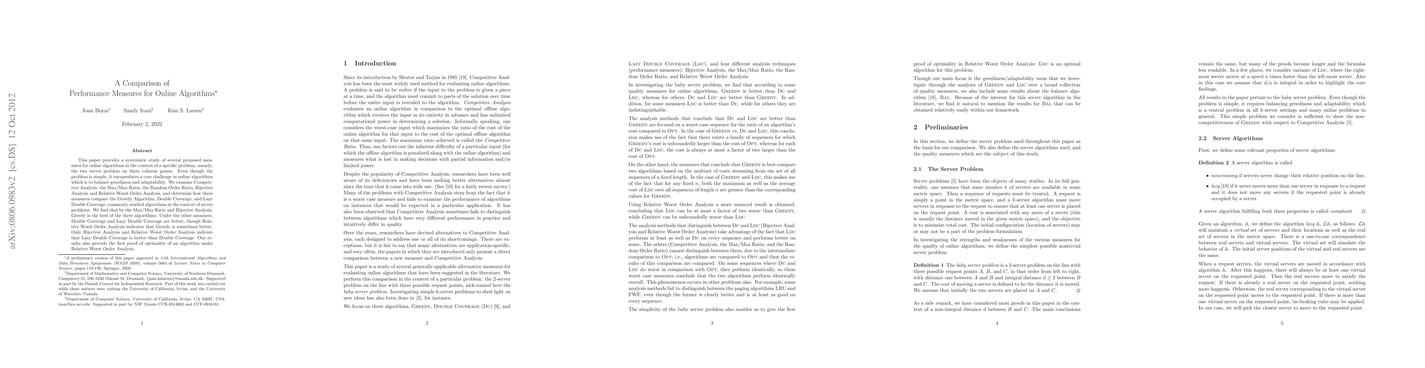 This paper provides a systematic study of several proposed measures for online algorithms in the context of a specific problem, namely, the two server problem on three colinear points. Even though the problem is simple, it encapsulates a core challenge in online algorithms which is to balance greediness and adaptability. We examine Competitive Analysis, the Max/Max Ratio, the Random Order Ratio, Bijective Analysis and Relative Worst Order Analysis, and determine how these measures compare the Greedy Algorithm, Double Coverage, and Lazy Double Coverage, commonly studied algorithms in the context of server problems. We find that by the Max/Max Ratio and Bijective Analysis, Greedy is the best of the three algorithms. Under the other measures, Double Coverage and Lazy Double Coverage are better, though Relative Worst Order Analysis indicates that Greedy is sometimes better. Only Bijective Analysis and Relative Worst Order Analysis indicate that Lazy Double Coverage is better than Double Coverage. Our results also provide the first proof of optimality of an algorithm under Relative Worst Order Analysis.