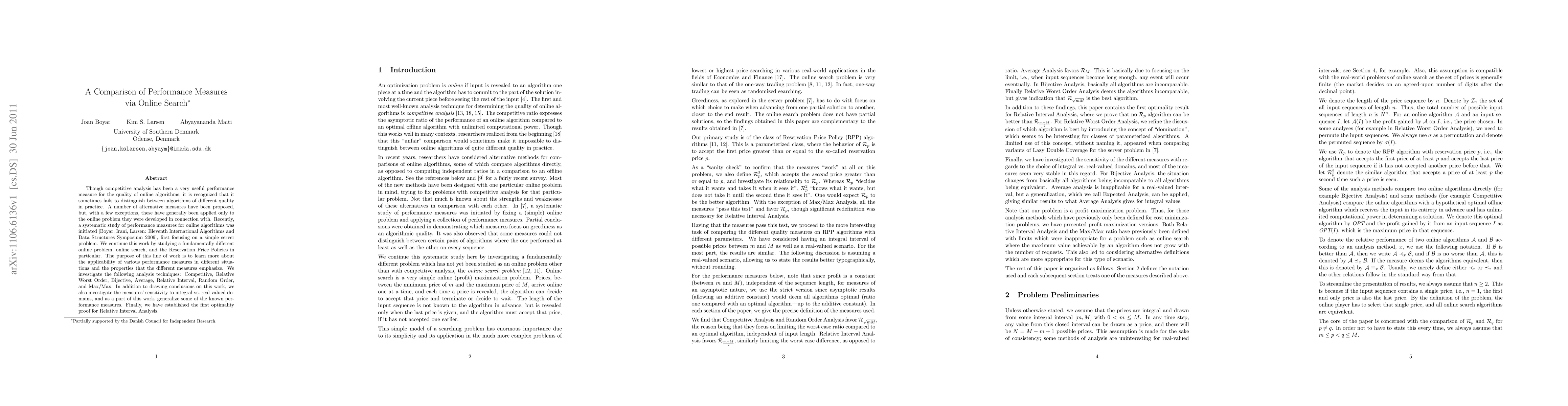 Though competitive analysis has been a very useful performance measure for the quality of online algorithms, it is recognized that it sometimes fails to distinguish between algorithms of different quality in practice. A number of alternative measures have been proposed, but, with a few exceptions, these have generally been applied only to the online problem they were developed in connection with. Recently, a systematic study of performance measures for online algorithms was initiated [Boyar, Irani, Larsen: Eleventh International Algorithms and Data Structures Symposium 2009], first focusing on a simple server problem. We continue this work by studying a fundamentally different online problem, online search, and the Reservation Price Policies in particular. The purpose of this line of work is to learn more about the applicability of various performance measures in different situations and the properties that the different measures emphasize. We investigate the following analysis techniques: Competitive, Relative Worst Order, Bijective, Average, Relative Interval, Random Order, and Max/Max. In addition to drawing conclusions on this work, we also investigate the measures' sensitivity to integral vs. real-valued domains, and as a part of this work, generalize some of the known performance measures. Finally, we have established the first optimality proof for Relative Interval Analysis.