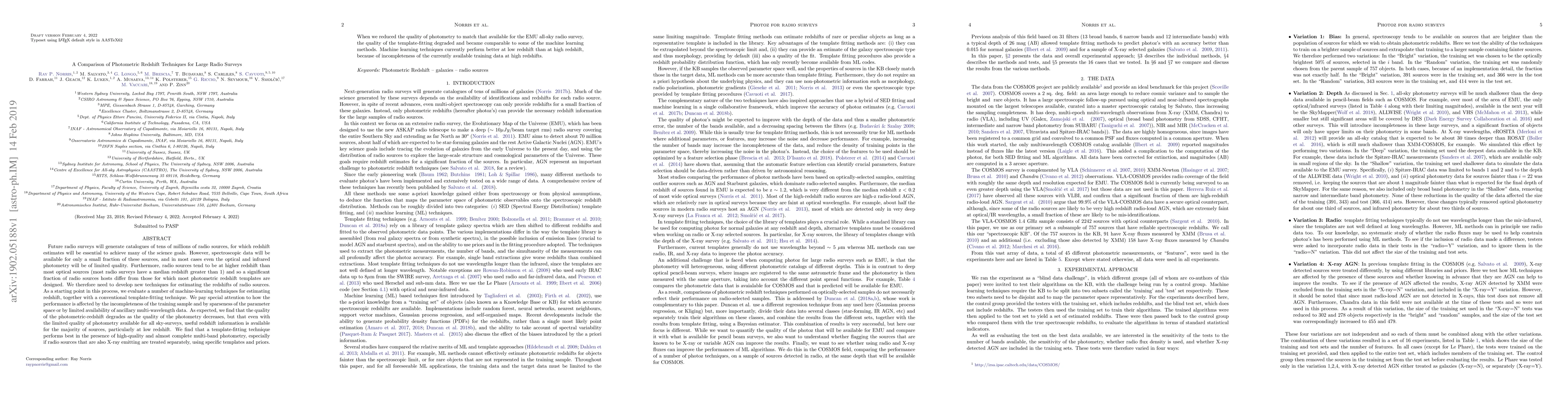 This paper compares various photometric redshift techniques for large radio surveys, finding that template-fitting works best with high-quality data but degrades with poorer photometry. Machine learning methods perform better at low redshifts but struggle with high-redshift data due to limited training samples.