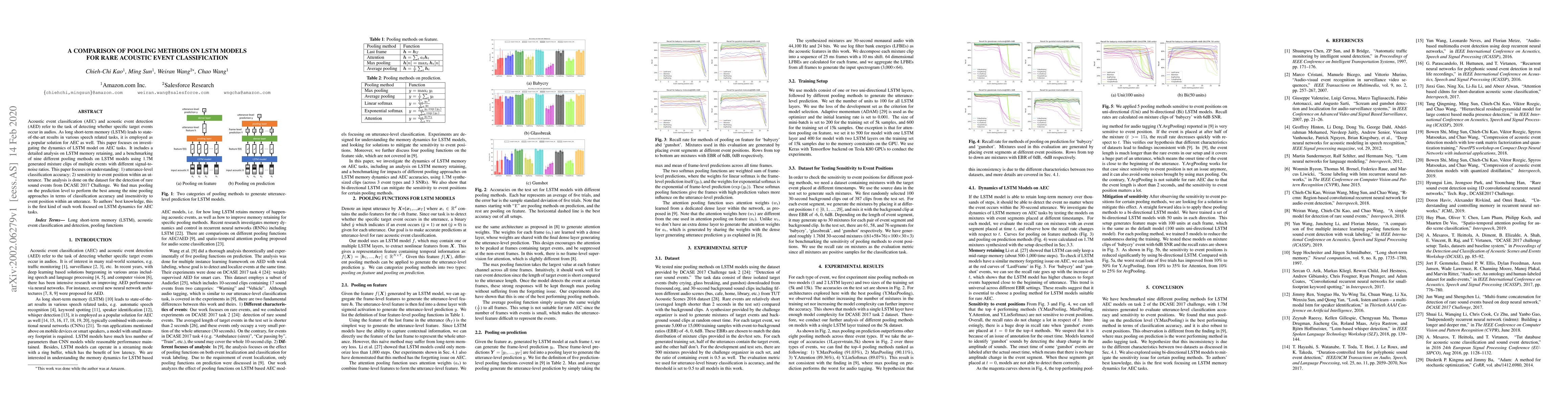 This paper benchmarks nine pooling methods on LSTM models for rare acoustic event classification, finding max pooling at the prediction level yields the best classification accuracy and insensitivity to event position. The study uses a dataset from the DCASE 2017 Challenge and is the first to focus on LSTM dynamics for such tasks.
