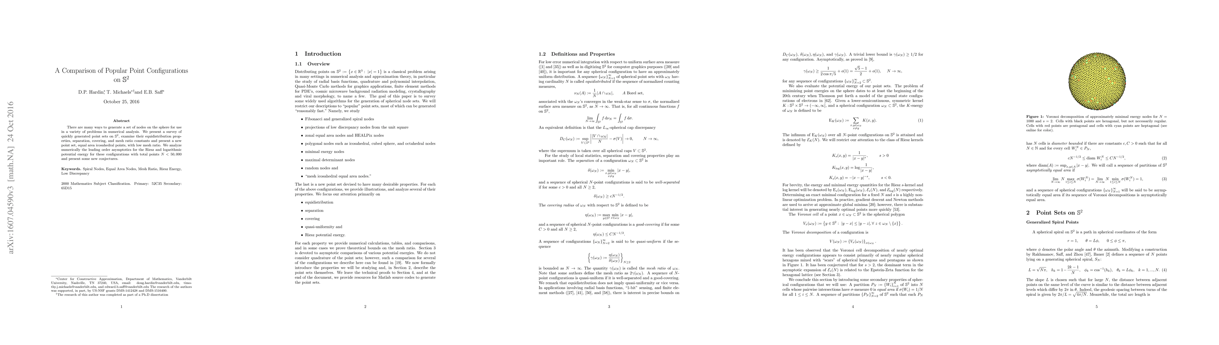 There are many ways to generate a set of nodes on the sphere for use in a variety of problems in numerical analysis. We present a survey of quickly generated point sets on $\mathbb{S}^2$, examine their equidistribution properties, separation, covering, and mesh ratio constants and present a new point set, equal area icosahedral points, with low mesh ratio. We analyze numerically the leading order asymptotics for the Riesz and logarithmic potential energy for these configurations with total points $N<50,000$ and present some new conjectures.