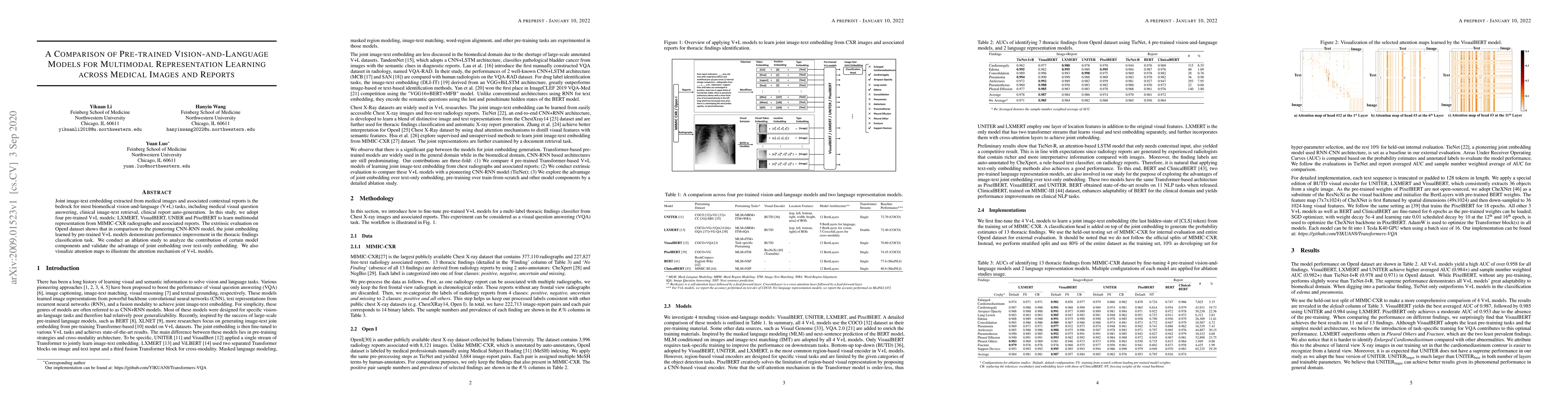 This study compares four pre-trained vision-and-language models—LXMERT, VisualBERT, UNIER, and PixelBERT—for learning multimodal representations from medical images and reports, showing improved performance over traditional CNN-RNN models in thoracic findings classification. The study also validates the benefits of joint embedding and provides attention map visualizations.