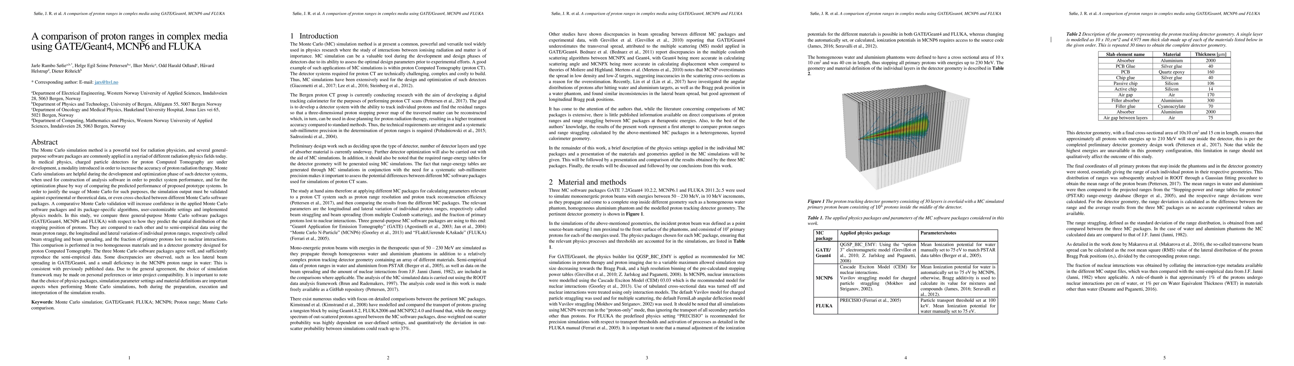 A study compares proton ranges in complex media using GATE/Geant4, MCNP6, and FLUKA, finding that the three software packages agree well with semi-empirical data but show some discrepancies, highlighting the importance of simulation parameter settings and material definitions.