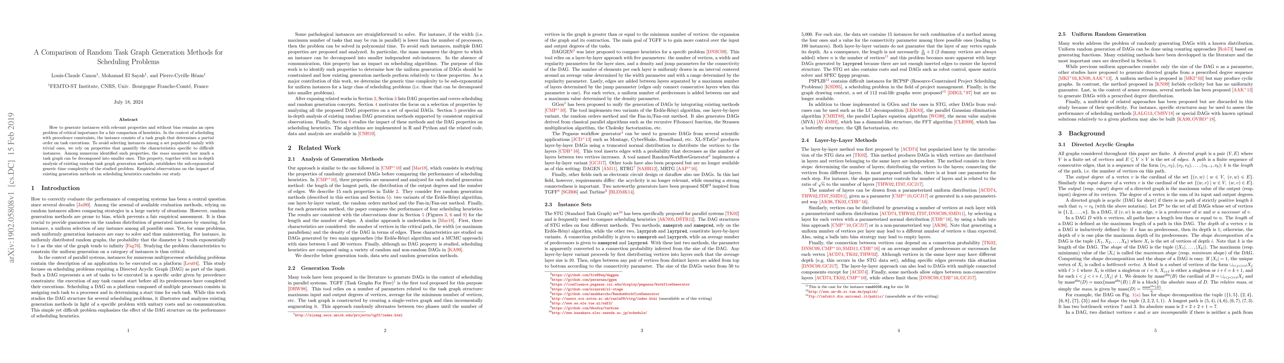 How to generate instances with relevant properties and without bias remains an open problem of critical importance for a fair comparison of heuristics. In the context of scheduling with precedence constraints, the instance consists of a task graph that determines a partial order on task executions. To avoid selecting instances among a set populated mainly with trivial ones, we rely on properties that quantify the characteristics specific to difficult instances. Among numerous identified such properties, the mass measures how much a task graph can be decomposed into smaller ones. This property, together with an in-depth analysis of existing random task graph generation methods, establishes the sub-exponential generic time complexity of the studied problem. Empirical observations on the impact of existing generation methods on scheduling heuristics concludes our study.