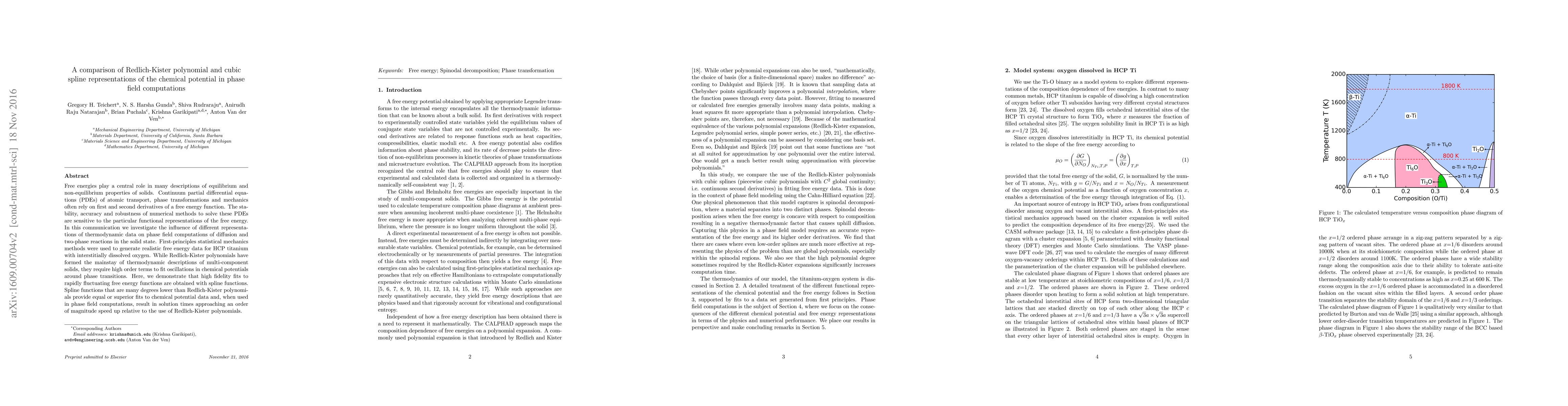 Free energies play a central role in many descriptions of equilibrium and non-equilibrium properties of solids. Continuum partial differential equations (PDEs) of atomic transport, phase transformations and mechanics often rely on first and second derivatives of a free energy function. The stability, accuracy and robustness of numerical methods to solve these PDEs are sensitive to the particular functional representations of the free energy. In this communication we investigate the influence of different representations of thermodynamic data on phase field computations of diffusion and two-phase reactions in the solid state. First-principles statistical mechanics methods were used to generate realistic free energy data for HCP titanium with interstitially dissolved oxygen. While Redlich-Kister polynomials have formed the mainstay of thermodynamic descriptions of multi-component solids, they require high order terms to fit oscillations in chemical potentials around phase transitions. Here we demonstrate that high fidelity fits to rapidly fluctuating free energy functions are obtained with spline functions. Spline functions that are many degrees lower than Redlich-Kister polynomials provide equal or superior fits to chemical potential data and, when used in phase field computations, result in solution times approaching an order of magnitude speed up relative to the use of Redlich-Kister polynomials.