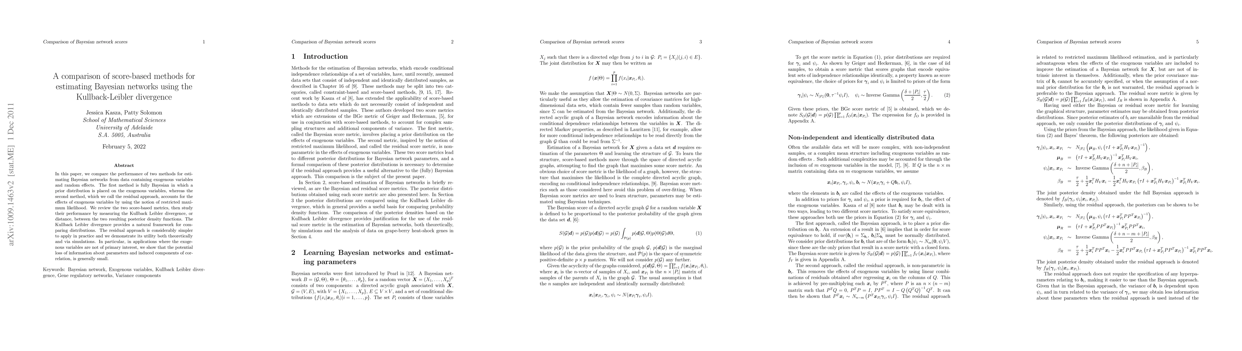 This paper compares two methods for estimating Bayesian networks: a fully Bayesian method and a simpler residual approach using restricted maximum likelihood. The performance is evaluated using the Kullback-Leibler divergence, showing that the residual approach is practical and generally incurs minimal loss of information when exogenous variables are not the main focus.