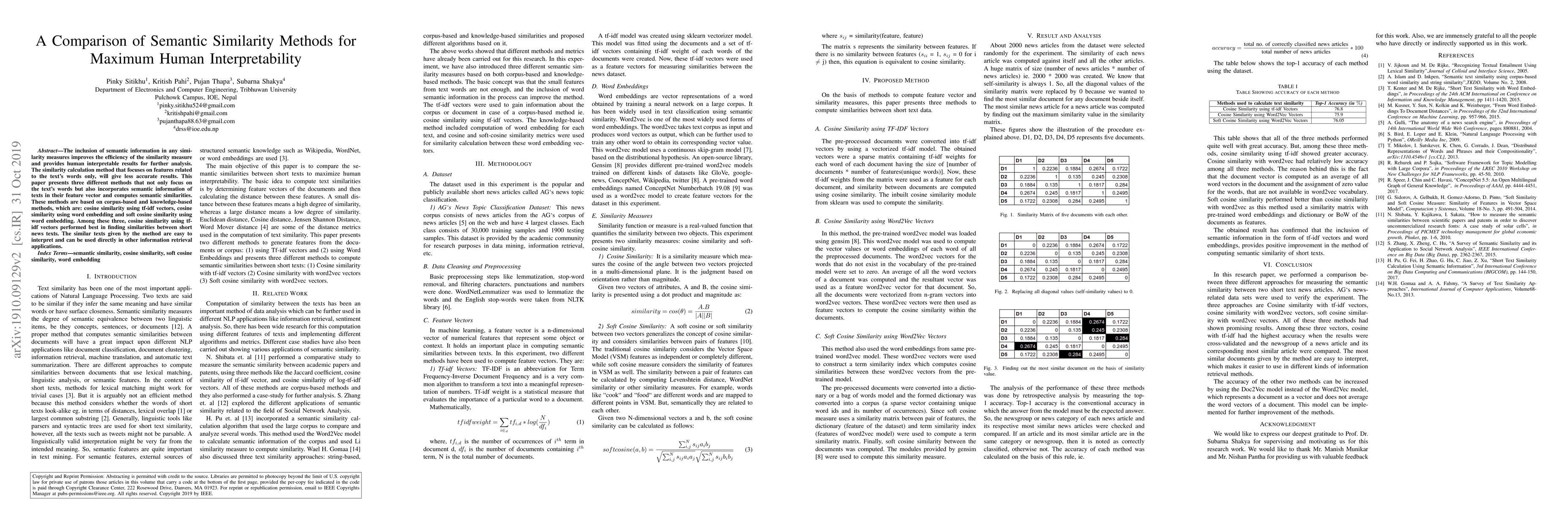 This paper compares three methods for semantic similarity: cosine similarity using tf-idf vectors, cosine similarity using word embeddings, and soft cosine similarity using word embeddings. The best performer, cosine similarity with tf-idf vectors, provides human-interpretable results for short news texts, enhancing information retrieval applications.