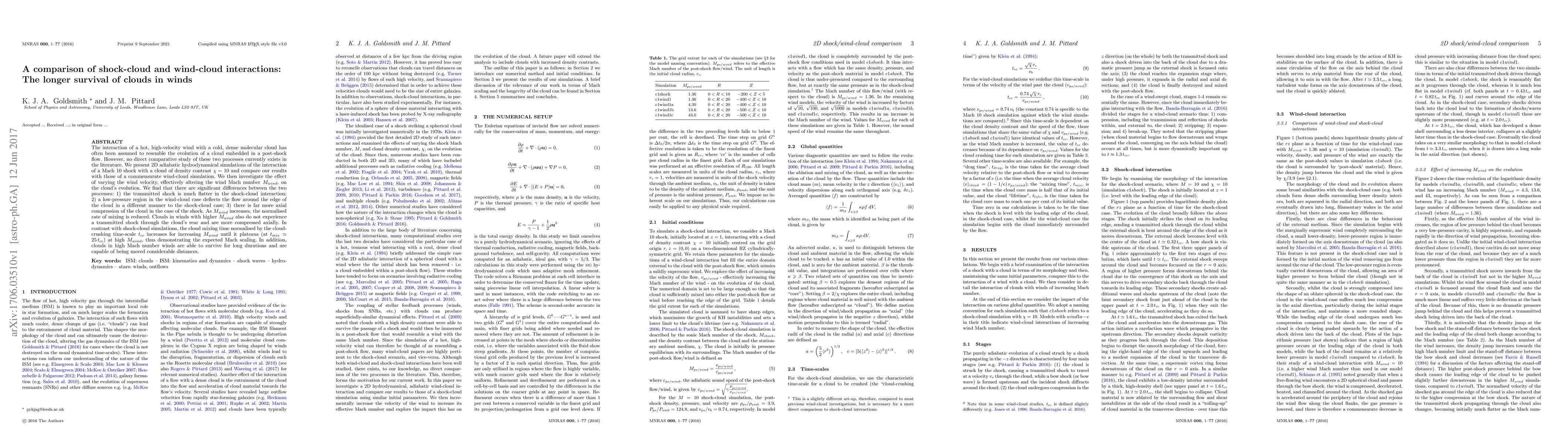 The interaction of a hot, high-velocity wind with a cold, dense molecular cloud has often been assumed to resemble the evolution of a cloud embedded in a post-shock flow. However, no direct comparative study of these two processes currently exists in the literature. We present 2D adiabatic hydrodynamical simulations of the interaction of a Mach 10 shock with a cloud of density contrast $\chi = 10$ and compare our results with those of a commensurate wind-cloud simulation. We then investigate the effect of varying the wind velocity, effectively altering the wind Mach number $M_{wind}$, on the cloud's evolution. We find that there are significant differences between the two processes: 1) the transmitted shock is much flatter in the shock-cloud interaction; 2) a low-pressure region in the wind-cloud case deflects the flow around the edge of the cloud in a different manner to the shock-cloud case; 3) there is far more axial compression of the cloud in the case of the shock. As $M_{wind}$ increases, the normalised rate of mixing is reduced. Clouds in winds with higher $M_{wind}$ also do not experience a transmitted shock through the cloud's rear and are more compressed axially. In contrast with shock-cloud simulations, the cloud mixing time normalised by the cloud-crushing time-scale $t_{cc}$ increases for increasing $M_{wind}$ until it plateaus (at $t_{mix} \simeq 25 \, t_{cc}$) at high $M_{wind}$, thus demonstrating the expected Mach scaling. In addition, clouds in high Mach number winds are able to survive for long durations and are capable of being moved considerable distances.