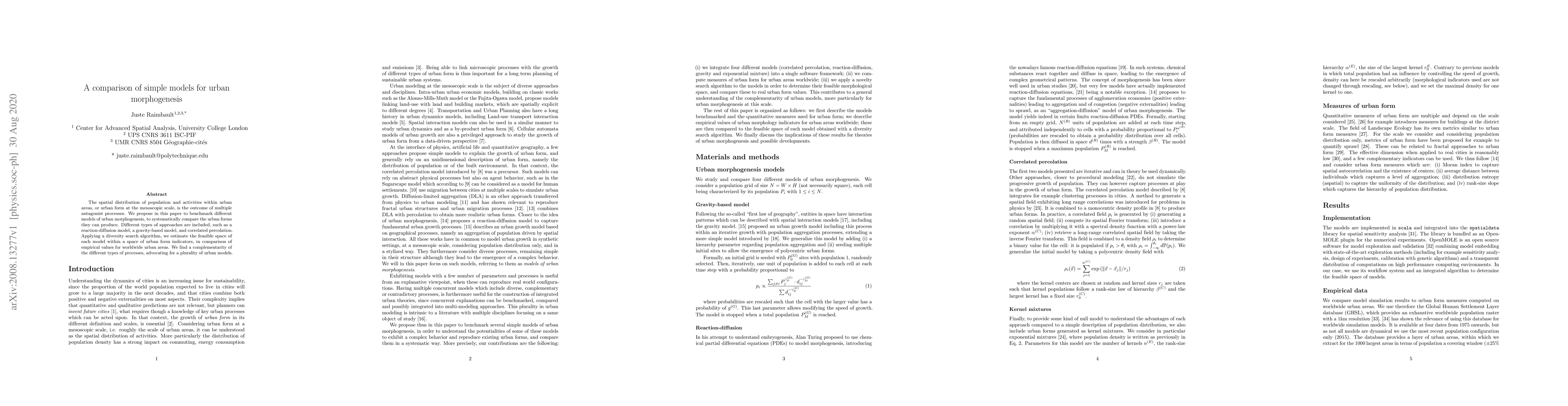 This paper benchmarks various simple models of urban morphogenesis, including reaction-diffusion, gravity-based, and correlated percolation, to compare their potential urban forms. The findings suggest a complementary diversity among these models, supporting the use of multiple urban growth models.
