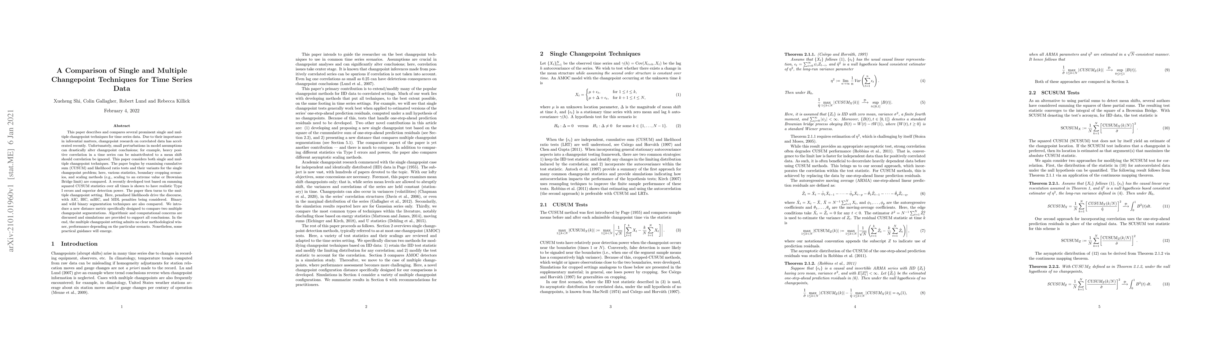 This paper compares various single and multiple changepoint techniques for time series data, evaluating methods like CUSUM, likelihood ratio tests, and penalized likelihoods. It finds no clear winner in the multiple changepoint setting, emphasizing the importance of scenario-specific considerations and providing practical guidance based on simulation results.