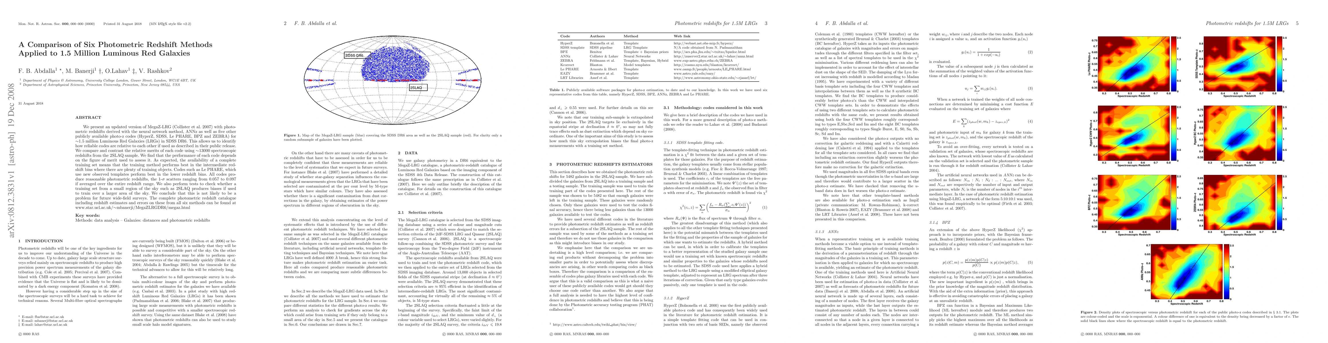 This paper compares six photometric redshift methods applied to 1.5 million Luminous Red Galaxies, finding that performance varies based on the assessment metric used and the redshift range. The study concludes that while all methods produce reasonable results, training methods like ANNz perform best in intermediate redshift bins, while others like Le PHARE excel in lower redshifts.