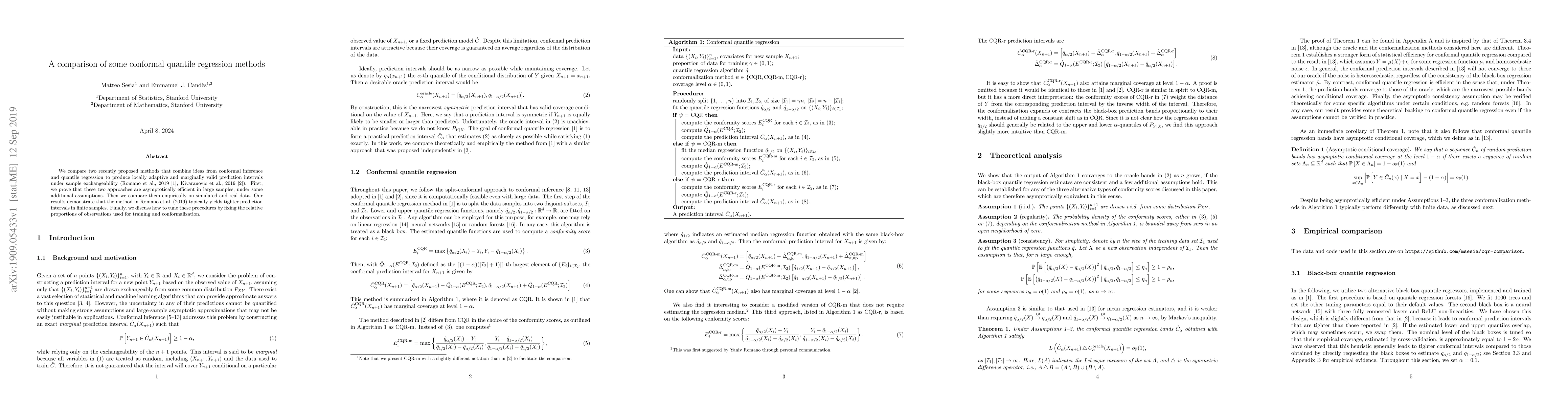 The paper compares two conformal quantile regression methods, proving their asymptotic efficiency in large samples and empirically evaluating them on simulated and real data.