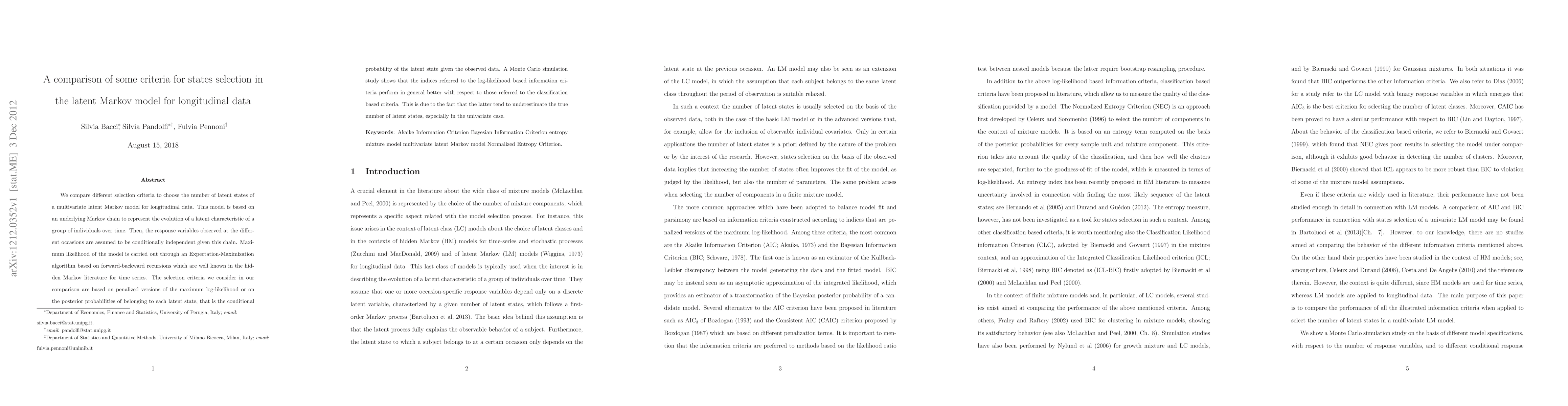 This paper compares various selection criteria for determining the number of latent states in a multivariate latent Markov model for longitudinal data. It finds that log-likelihood based information criteria generally perform better than classification-based criteria, especially in underestimating the true number of latent states.