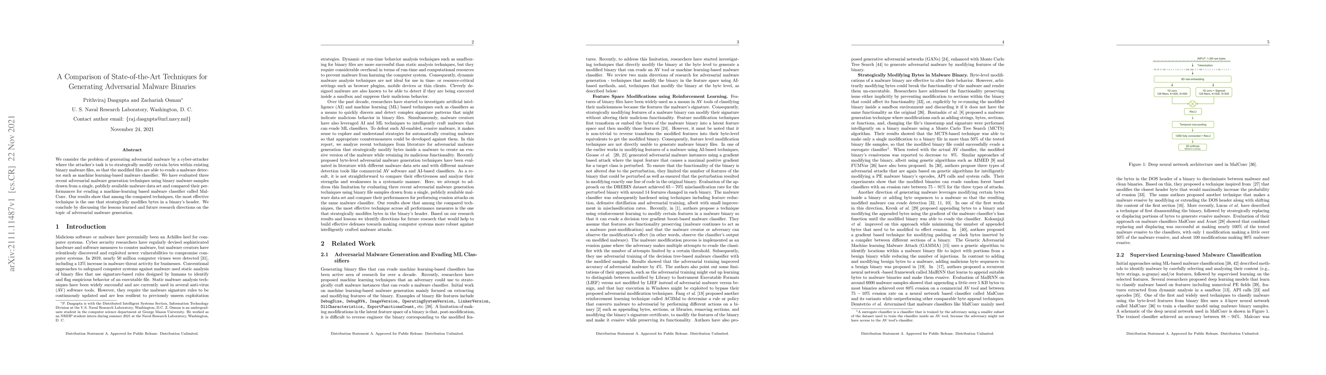 This paper evaluates three state-of-the-art techniques for generating adversarial malware that can evade detection by machine learning classifiers, specifically focusing on modifying binary malware files. The study finds that the most effective method strategically alters bytes in the binary's header, highlighting the importance of this approach for future research in adversarial malware generation.
