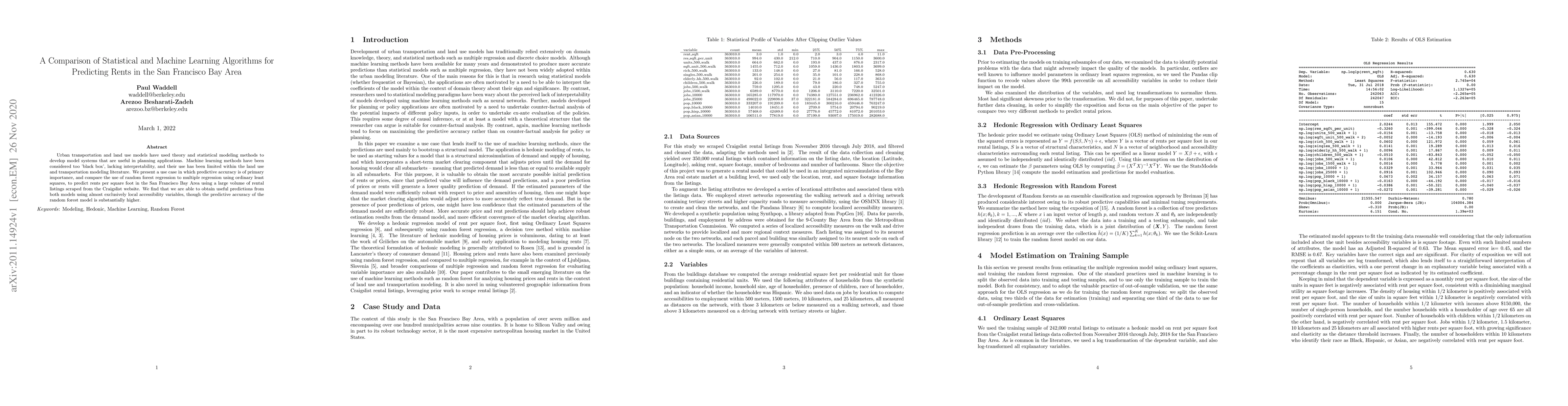 This study compares the predictive accuracy of random forest regression and ordinary least squares multiple regression for forecasting rents in the San Francisco Bay Area. The random forest model, despite its "black box" nature, outperforms the traditional statistical model in accuracy, highlighting its potential in urban planning applications.