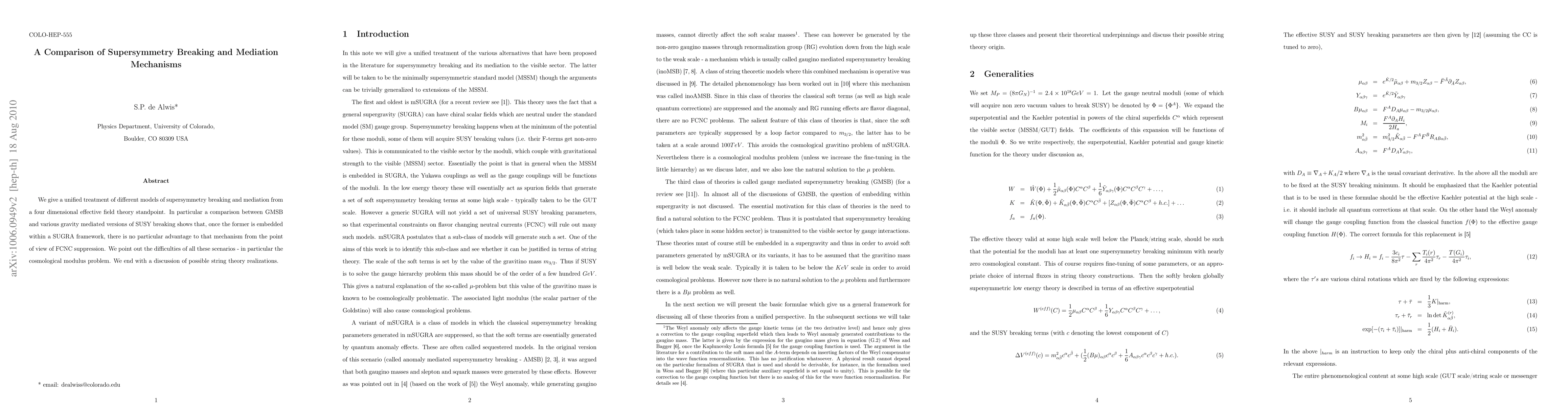This paper compares various models of supersymmetry breaking and mediation, finding no significant advantage of gauge-mediated SUSY breaking (GMSB) over gravity-mediated versions when embedded within a SUGRA framework, especially regarding FCNC suppression. It also highlights the cosmological modulus problem and discusses potential string theory realizations.