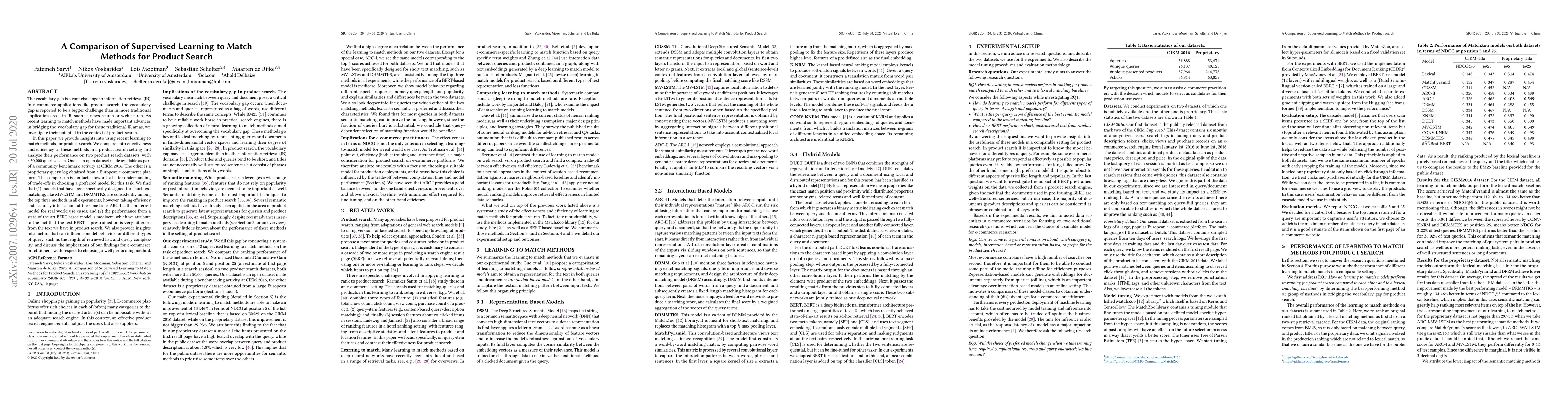 A study compares supervised learning to match methods with traditional IR methods in product search, finding that models like MV-LSTM outperform BERT-based models due to the vocabulary gap, while ARC-I is preferred for efficiency and accuracy.
