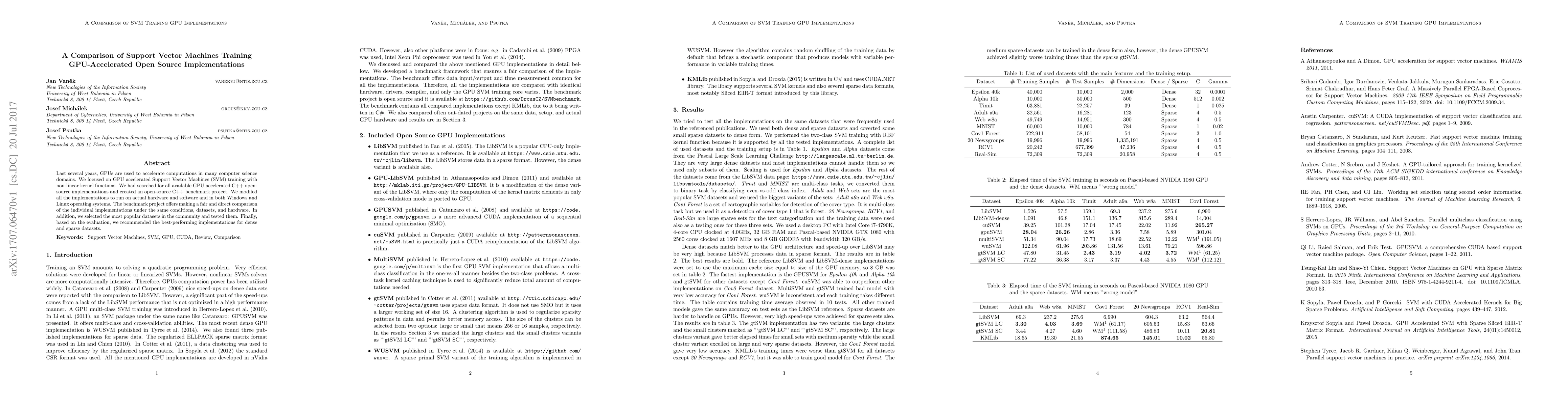This paper benchmarks GPU-accelerated open-source C++ implementations of Support Vector Machines (SVM) training with non-linear kernels, comparing their performance across Windows and Linux systems. The study recommends the best-performing implementations for dense and sparse datasets based on comprehensive testing with popular datasets.