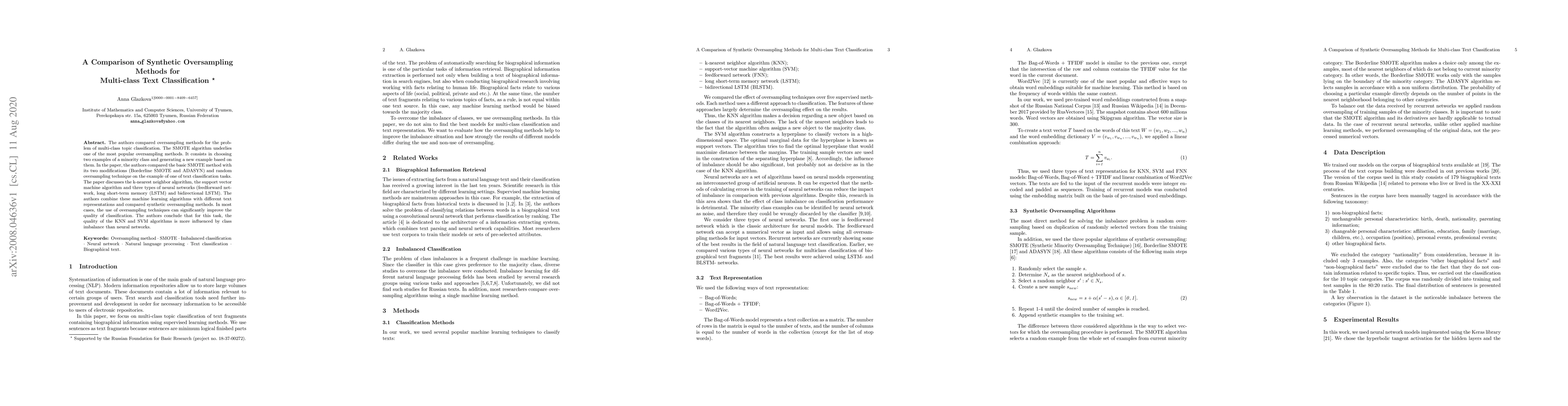 The authors compared oversampling methods for the problem of multi-class topic classification. The SMOTE algorithm underlies one of the most popular oversampling methods. It consists in choosing two examples of a minority class and generating a new example based on them. In the paper, the authors compared the basic SMOTE method with its two modifications (Borderline SMOTE and ADASYN) and random oversampling technique on the example of one of text classification tasks. The paper discusses the k-nearest neighbor algorithm, the support vector machine algorithm and three types of neural networks (feedforward network, long short-term memory (LSTM) and bidirectional LSTM). The authors combine these machine learning algorithms with different text representations and compared synthetic oversampling methods. In most cases, the use of oversampling techniques can significantly improve the quality of classification. The authors conclude that for this task, the quality of the KNN and SVM algorithms is more influenced by class imbalance than neural networks.
