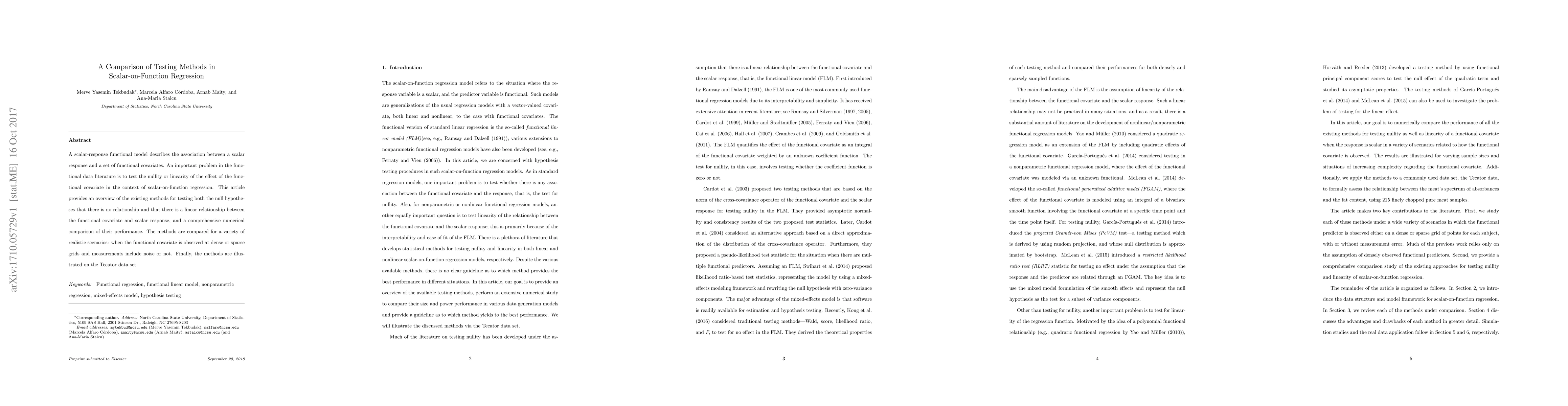 This paper reviews and compares various testing methods for assessing the relationship and linearity between a scalar response and functional covariates in scalar-on-function regression. It evaluates their performance across different scenarios and demonstrates the methods using the Tecator dataset.