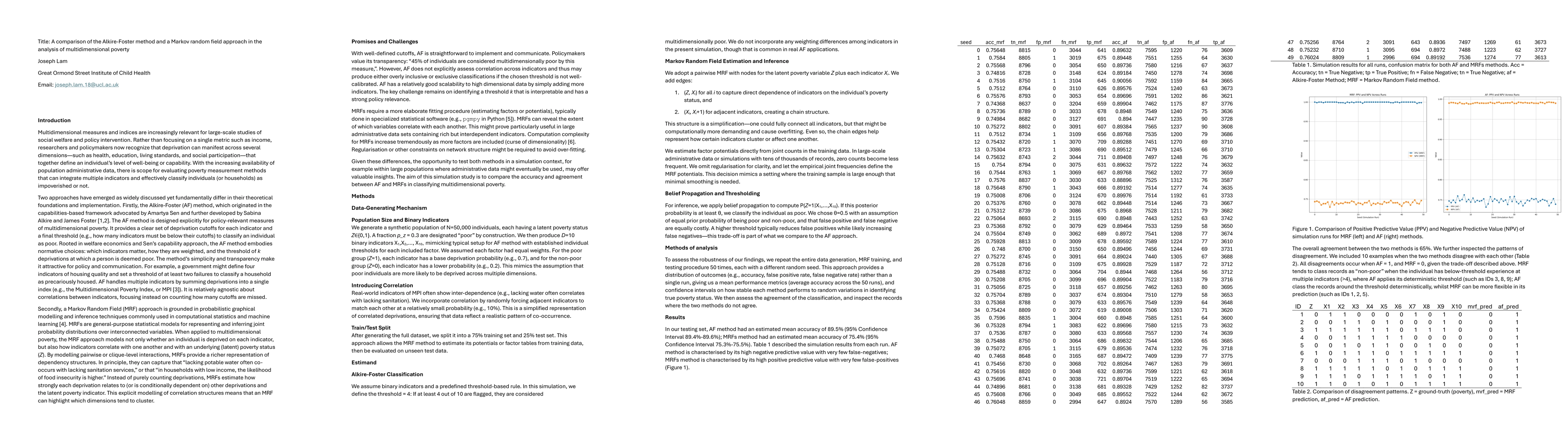 This study compares the Alkire-Foster (AF) method and a Markov Random Field (MRF) approach using a synthetic dataset of 50,000 individuals with ten binary deprivation indicators. The comparison is based on classification accuracy, false positive/negative trade-offs, and agreement between the methods, assessed through a simulation-based analysis.