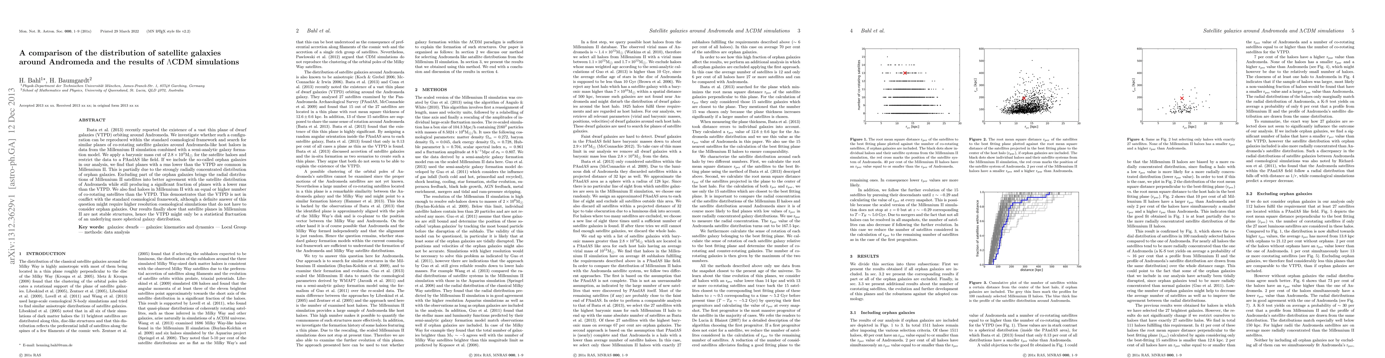 Ibata et al. (2013) recently reported the existence of a vast thin plane of dwarf galaxies (VTPD) orbiting around Andromeda. We investigate whether such a configuration can be reproduced within the standard cosmological framework and search for similar planes of co-rotating satellite galaxies around Andromeda-like host haloes in data from the Millennium II simulation combined with a semi-analytic galaxy formation model. We apply a baryonic mass cut of $2.8\times 10^4 \text{M}_{\text{sun}}$ for the satellite haloes and restrict the data to a PAndAS like field. If we include the so-called orphan galaxies in our analysis, we find that planes with a rms lower than the VTPD are common in Millennium II. This is partially due to the strongly radially concentrated distribution of orphan galaxies. Excluding part of the orphan galaxies brings the radial distributions of Millennium II satellites into better agreement with the satellite distribution of Andromeda while still producing a significant fraction of planes with a lower rms than the VTPD. We also find haloes in Millennium II with an equal or higher number of co-rotating satellites than the VTPD. This demonstrates that the VTPD is not in conflict with the standard cosmological framework, although a definite answer of this question might require higher resolution cosmological simulations that do not have to consider orphan galaxies. Our results finally show that satellite planes in Millennium II are not stable structures, hence the VTPD might only be a statistical fluctuation of an underlying more spherical galaxy distribution.
