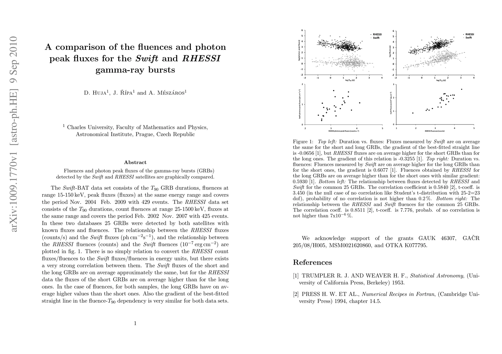 Fluences and photon peak fluxes of the gamma-ray bursts (GRBs) detected by the Swift and RHESSI satellites are graphically compared.