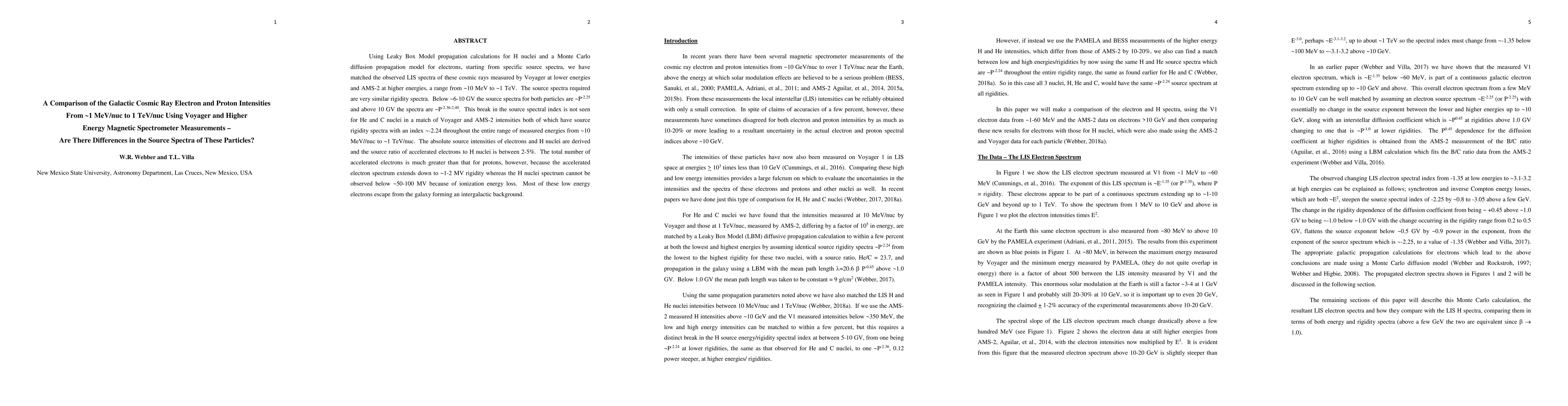 Using Leaky Box Model propagation calculations for H nuclei and a Monte Carlo diffusion propagation model for electrons, starting from specific source spectra, we have matched the observed LIS spectra of these cosmic rays measured by Voyager at lower energies and AMS-2 at higher energies, a range from ~10 MeV to ~1 TeV. The source spectra required are very similar rigidity spectra. Below ~6-10 GV the source spectra for both particles are ~P-2.25 and above 10 GV the spectra are ~P-2.36-2.40. This break in the source spectral index is not seen for He and C nuclei in a match of Voyager and AMS-2 intensities both of which have source rigidity spectra with an index ~-2.24 throughout the entire range of measured energies from ~10 MeV//nuc to ~1 TeV/nuc. The absolute source intensities of electrons and H nuclei are derived and the source ratio of accelerated electrons to H nuclei is between 2-5%. The total number of accelerated electrons is much greater than that for protons, however, because the accelerated electron spectrum extends down to ~1-2 MV rigidity whereas the H nuclei spectrum cannot be observed below ~50-100 MV because of ionization energy loss. Most of these low energy electrons escape from the galaxy forming an intergalactic background.