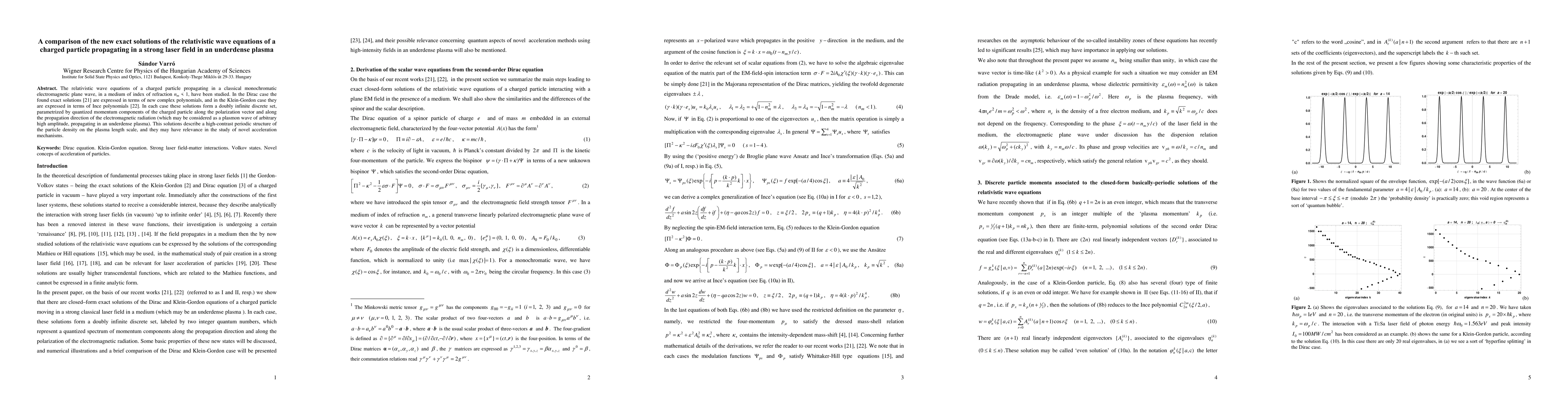 The relativistic wave equations of a charged particle propagating in a classical monochromatic electromagnetic plane wave, in a medium of index of refraction n_m < 1, have been studied. In the Dirac case the found exact solutions [arXiv:1305.4370] are expressed in terms of new complex polynomials, and in the Klein-Gordon case they are expressed in term of Ince polynomials [arXiv:1306.0097]. In each case these solutions form a doubly infinite discrete set, parametrized by quantized momentum components of the charged particle along the polarization vector and along the propagation direction of the electromagnetic radiation (which may be considered as a plasmon wave of arbitrary high amplitude, propagating in an underdense plasma). These solutions describe a high-contrast periodic structure of the particle density on the plasma length scale, and they may have relevance in the study of novel acceleration mechanisms.