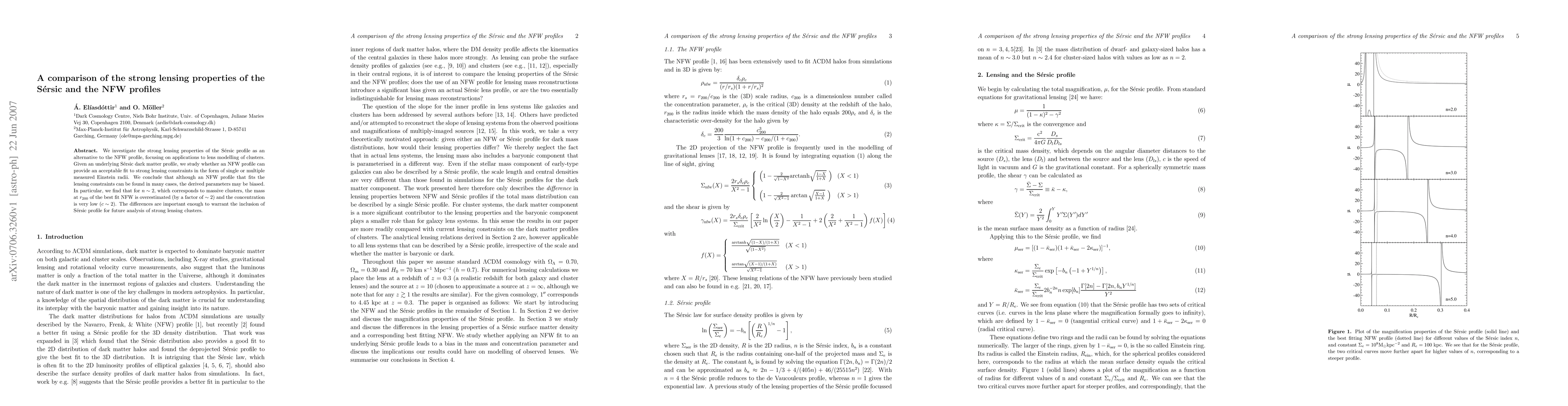 A study compares the strong lensing properties of Sersic and NFW dark matter profiles, finding that while an NFW profile can fit some lensing constraints, its parameters may be biased for massive clusters.