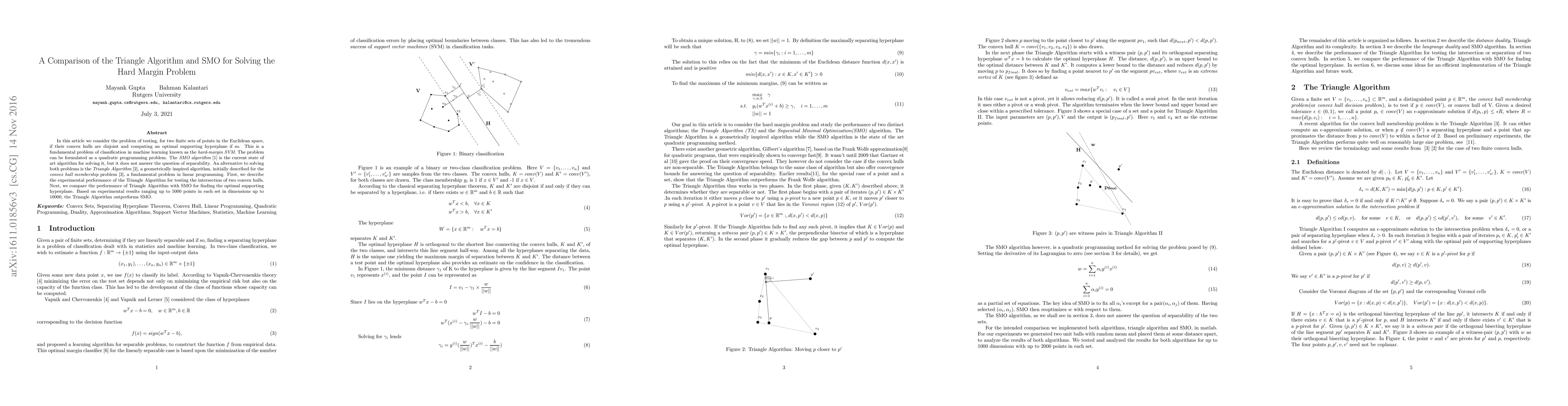 In this article we consider the problem of testing, for two finite sets of points in the Euclidean space, if their convex hulls are disjoint and computing an optimal supporting hyperplane if so. This is a fundamental problem of classification in machine learning known as the hard-margin SVM. The problem can be formulated as a quadratic programming problem. The SMO algorithm is the current state of art algorithm for solving it, but it does not answer the question of separability. An alternative to solving both problems is the Triangle Algorithm, a geometrically inspired algorithm, initially described for the convex hull membership problem, a fundamental problem in linear programming. First, we describe the experimental performance of the Triangle Algorithm for testing the intersection of two convex hulls. Next, we compare the performance of Triangle Algorithm with SMO for finding the optimal supporting hyperplane. Based on experimental results ranging up to 5000 points in each set in dimensions up to 10000, the Triangle Algorithm outperforms SMO.