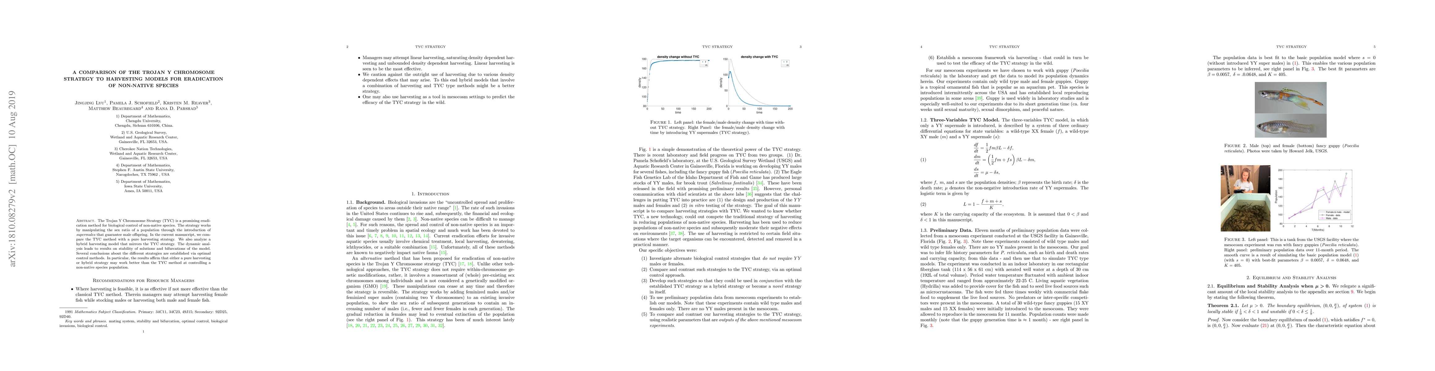 This paper compares the Trojan Y Chromosome Strategy (TYC) for controlling invasive species with traditional harvesting models. The analysis finds that pure or hybrid harvesting strategies may be more effective than TYC in managing non-native species populations, based on stability, boundedness, and bifurcation results derived through optimal control methods.