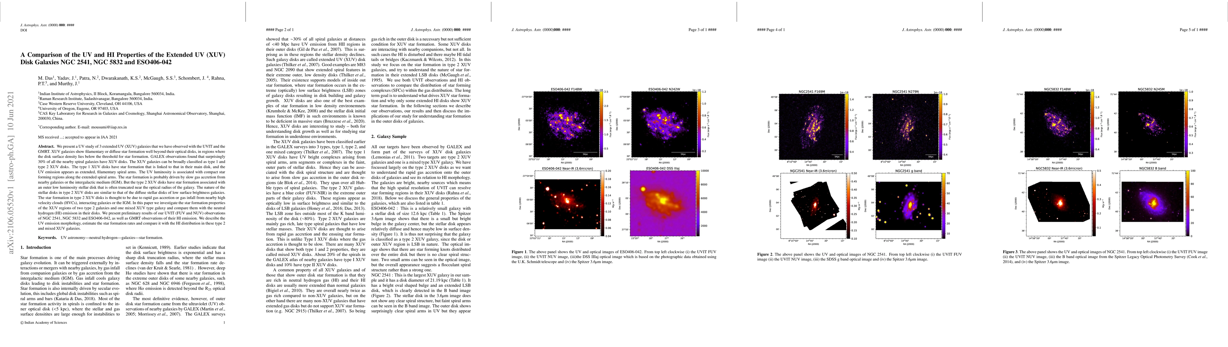 We present a UV study of 3 extended UV (XUV) galaxies that we have observed with the UVIT and the GMRT. XUV galaxies show filamentary or diffuse star formation well beyond their optical disks, in regions where the disk surface density lies below the threshold for star formation. GALEX observations found that surprisingly 30% of all the nearby spiral galaxies have XUV disks. The XUV galaxies can be broadly classified as type 1 and type 2 XUV disks. The type 1 XUV disks have star formation that is linked to that in their main disk, and the UV emission appears as extended, filamentary spiral arms. The UV luminosity is associated with compact star forming regions along the extended spiral arms. The star formation is probably driven by slow gas accretion from nearby galaxies or the intergalactic medium (IGM). But the type 2 XUV disks have star formation associated with an outer low luminosity stellar disk that is often truncated near the optical radius of the galaxy. The nature of the stellar disks in type 2 XUV disks are similar to that of the diffuse stellar disks of low surface brightness galaxies. The star formation in type 2 XUV disks is thought to be due to rapid gas accretion or gas infall from nearby high velocity clouds (HVCs), interacting galaxies or the IGM. In this paper we investigate the star formation properties of the XUV regions of two type 2 galaxies and one mixed XUV type galaxy and compare them with the neutral hydrogen (HI) emission in their disks. We present preliminary results of our UVIT (FUV and NUV) observations of NGC 2541, NGC 5832 and ESO406-042, as well as GMRT observations of their HI emission. We describe the UV emission morphology, estimate the star formation rates and compare it with the HI distribution in these type 2 and mixed XUV galaxies.