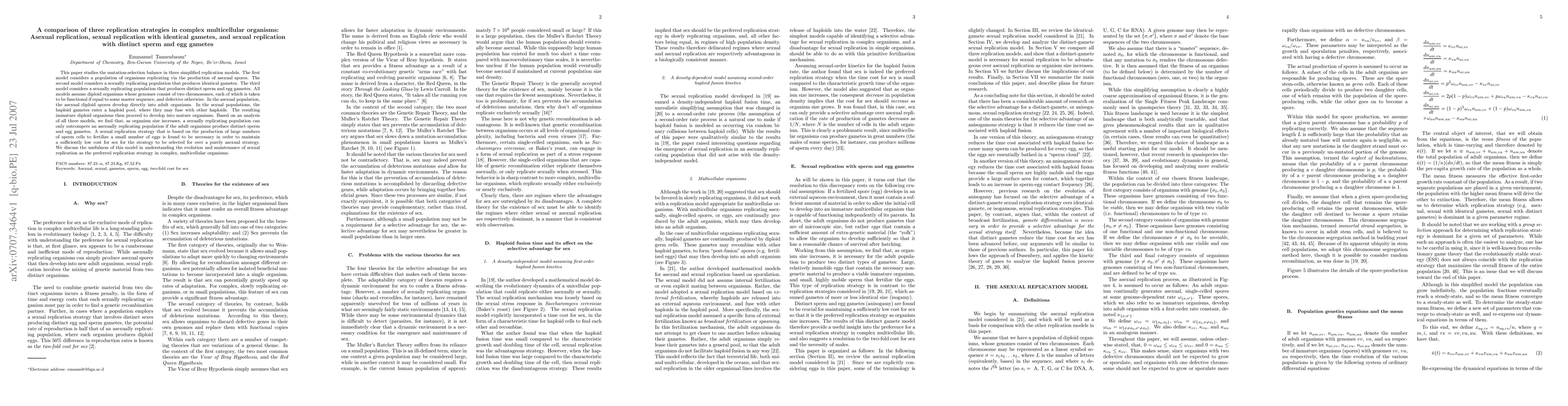This paper compares three replication strategies in multicellular organisms: asexual replication, sexual replication with identical gametes, and sexual replication with distinct sperm and egg gametes. It finds that sexual replication with distinct gametes is favored as organism size increases, necessitating large numbers of sperm to maintain a low cost for sex.