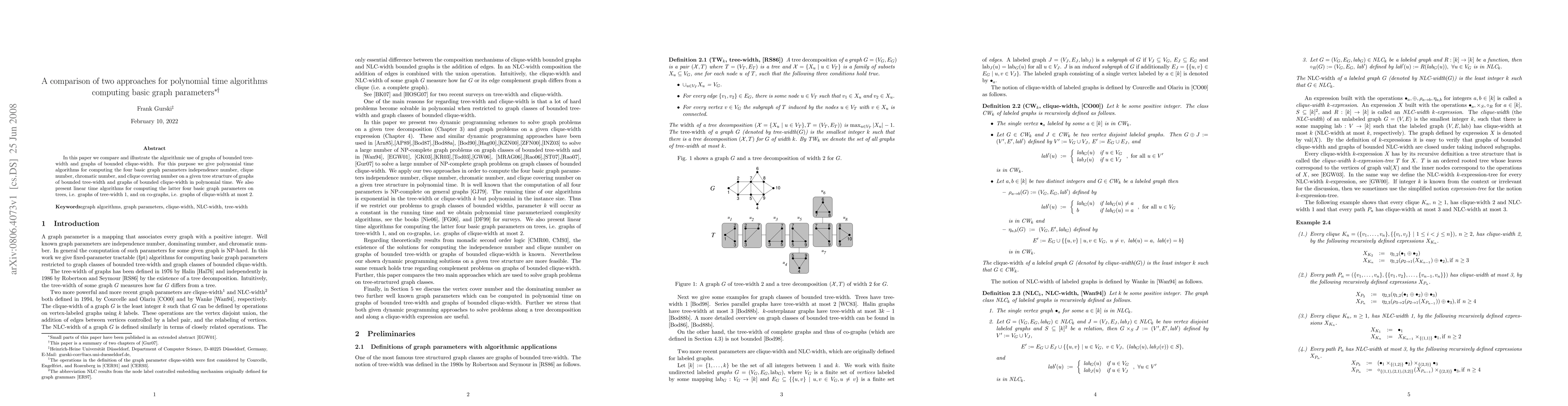 In this paper we compare and illustrate the algorithmic use of graphs of bounded tree-width and graphs of bounded clique-width. For this purpose we give polynomial time algorithms for computing the four basic graph parameters independence number, clique number, chromatic number, and clique covering number on a given tree structure of graphs of bounded tree-width and graphs of bounded clique-width in polynomial time. We also present linear time algorithms for computing the latter four basic graph parameters on trees, i.e. graphs of tree-width 1, and on co-graphs, i.e. graphs of clique-width at most 2.